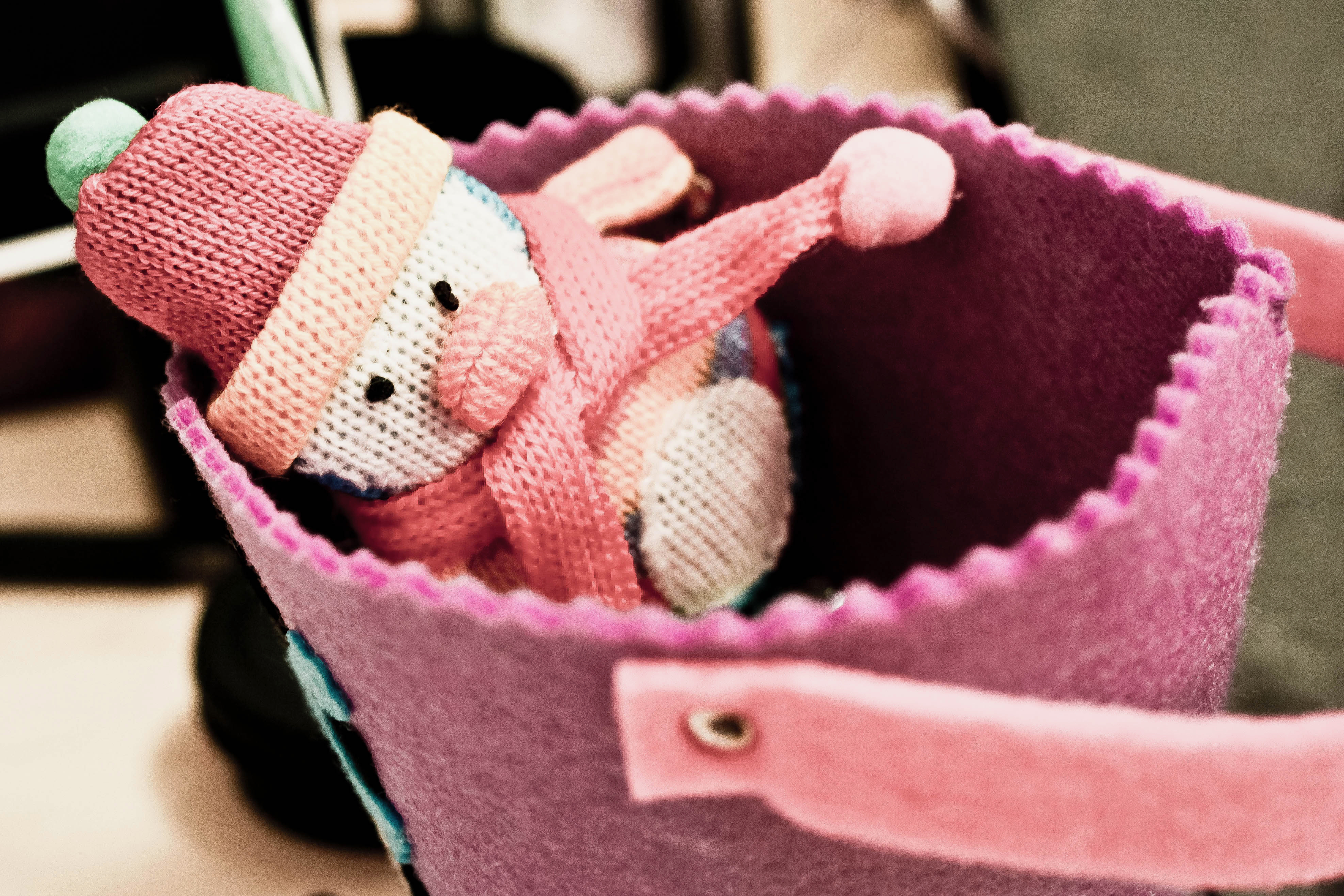 Nestled inside a colorful felt bag, a charming knitted snowman, dressed in a pink scarf and hat, radiates warmth and playfulness. The soft lighting casts a gentle glow, enhancing the cozy atmosphere while showcasing the vibrant colors of the snowman and the bag. This intimate composition evokes a sense of nostalgia and seasonal cheer, inviting viewers to embrace the joy of winter.