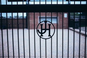 The photograph captures a close-up view of an iron gate adorned with a circular emblem, featuring the initials 'JH'. The muted tones and soft lighting evoke a sense of tranquility and quiet mystery, while the lines of the gate create a striking geometric composition. The empty space beyond the gate adds an air of anticipation, suggesting a story waiting to unfold.