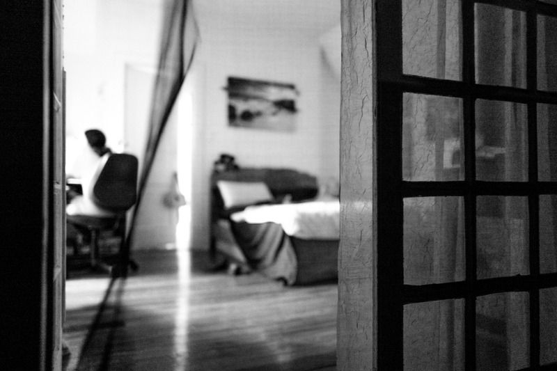 A glimpse into a serene room captures a figure seated at a desk, absorbed in thought. The soft, diffused lighting creates a calm atmosphere, while the interplay of shadows and the blurred foreground draws the viewer's eye deeper into the intimate setting. The composition evokes a sense of solitude and introspection, inviting contemplation of the personal space.