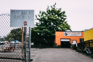 In this photograph, a handmade sign reading "We are all Americans" stands prominently against a chain-link fence, evoking a sense of solidarity amidst a backdrop of vibrant yet humble community buildings. The overcast sky casts a muted light, enhancing the reflective mood while the lush green foliage offers a contrast to the industrial elements. The composition directs the viewer's gaze toward the message of unity, subtly framed by the surroundings that hint at a gathering space for community action.