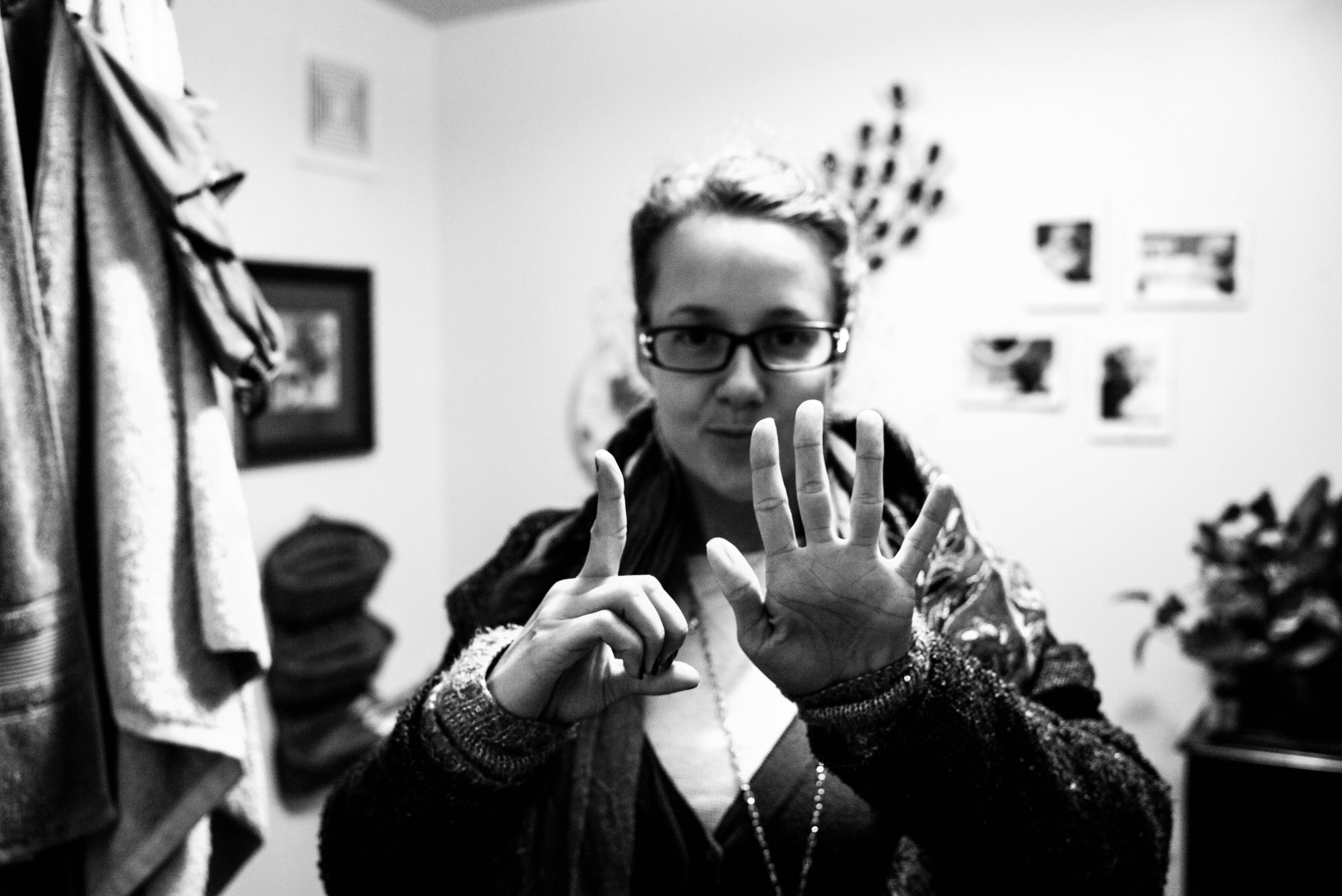 In a cozy, softly lit room, a woman plays with the concepts of counting and connection, raising her fingers as if to share a message. The monochromatic tones create an intimate mood, while the blurred background hints at personal surroundings filled with memories. Her expression is thoughtful, inviting curiosity about the significance of her gesture.