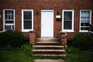 The photograph captures a modest brick facade of a home, dominated by a bright white door that invites warmth amidst the muted tones of the surroundings. Soft natural light illuminates the scene, enhancing the tidy but slightly overgrown lawn, evoking a sense of nostalgia and tranquility. The composition centers on the entrance, creating a focal point that suggests both familiarity and openness.