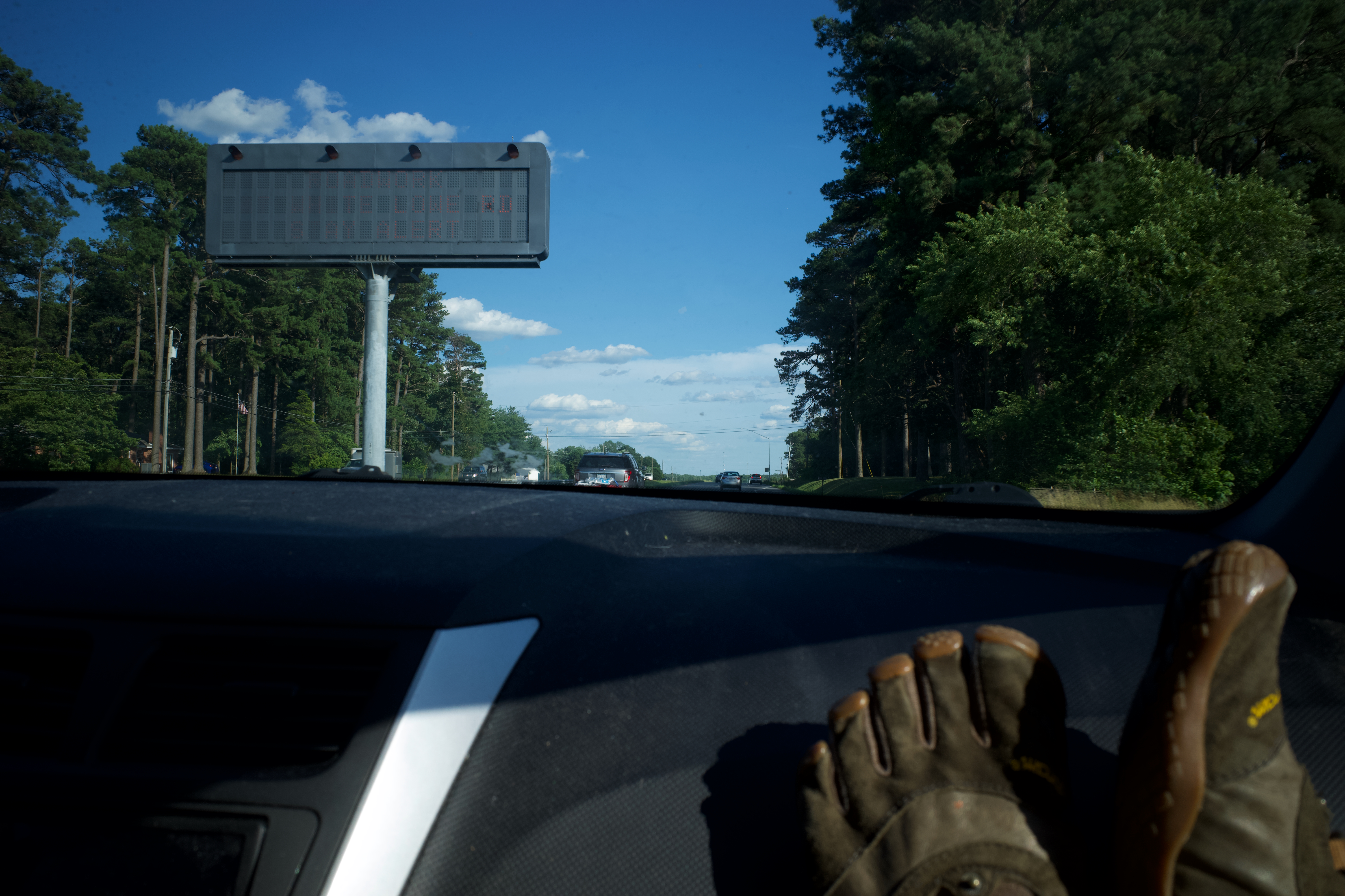 The photograph captures a candid moment from inside a car, focusing on a pair of bare feet resting on the dashboard against a backdrop of a clear blue sky dotted with fluffy clouds. The composition leads the eye toward a distant highway billboard framed by lush greenery, evoking a sense of freedom and adventure. The bright lighting enhances the tranquil yet vibrant mood of a leisurely drive through nature.