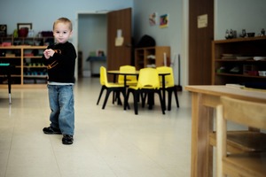 In a brightly lit classroom, a young boy stands confidently, striking a playful pose amidst the colorful decor and cheerful yellow chairs. The composition draws attention to his engaging expression, creating a sense of curiosity and wonder. The soft lighting enhances the intimate mood, capturing the essence of childhood exploration in a safe environment.