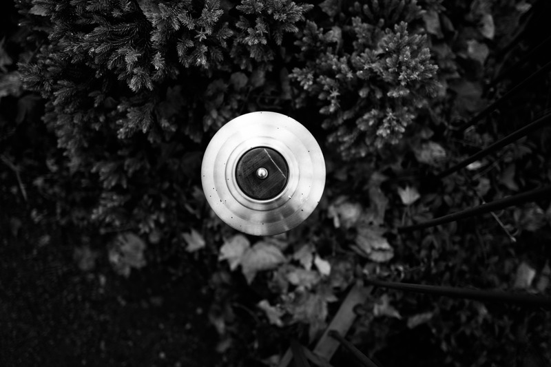 A solitary metallic object rises above a lush green canvas, its smooth form contrasting with the wild textures of foliage surrounding it. The black and white composition adds a timeless quality, evoking a sense of serenity and contemplation. Subtle play of light highlights the object's contours while shadows deepen the natural backdrop, creating a harmonious balance between man-made and organic elements.