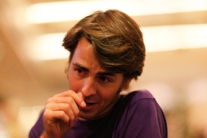 A young man sits in a relaxed pose, deep in thought, with a shy smile creeping onto his face. The soft, warm lighting creates a cozy atmosphere, accentuating his expressive features and the blurred background adds to the intimate feel of the scene. His hand gestures suggest a moment of reflection, inviting curiosity about his thoughts.