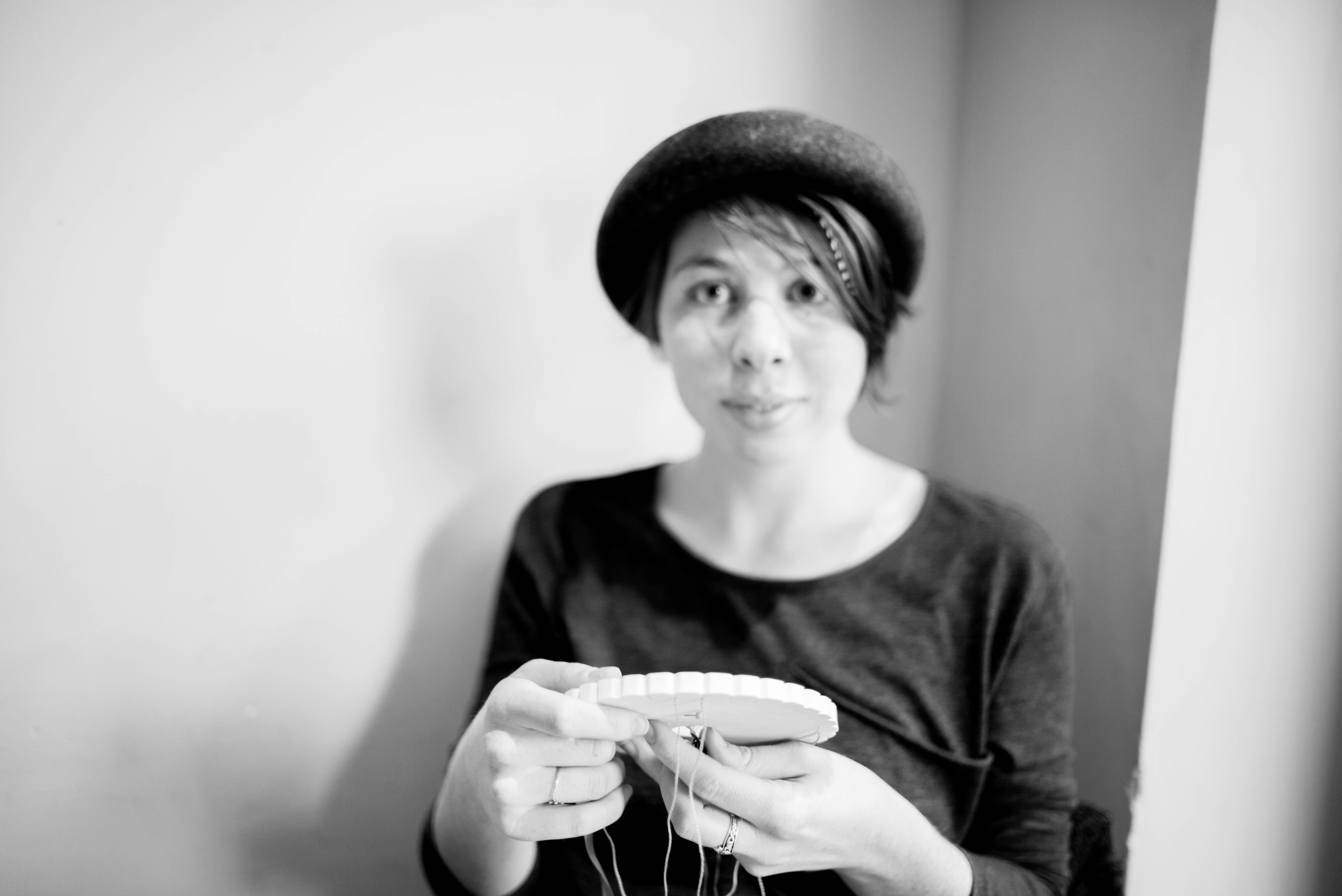 In this striking black-and-white portrait, a woman holds a crafting tool, her gaze piercing yet contemplative. The soft light illuminates her features, casting gentle shadows that enhance the intimate mood of the scene. The minimalistic background draws attention to her expression and the delicate work at hand, capturing a moment of quiet creativity.