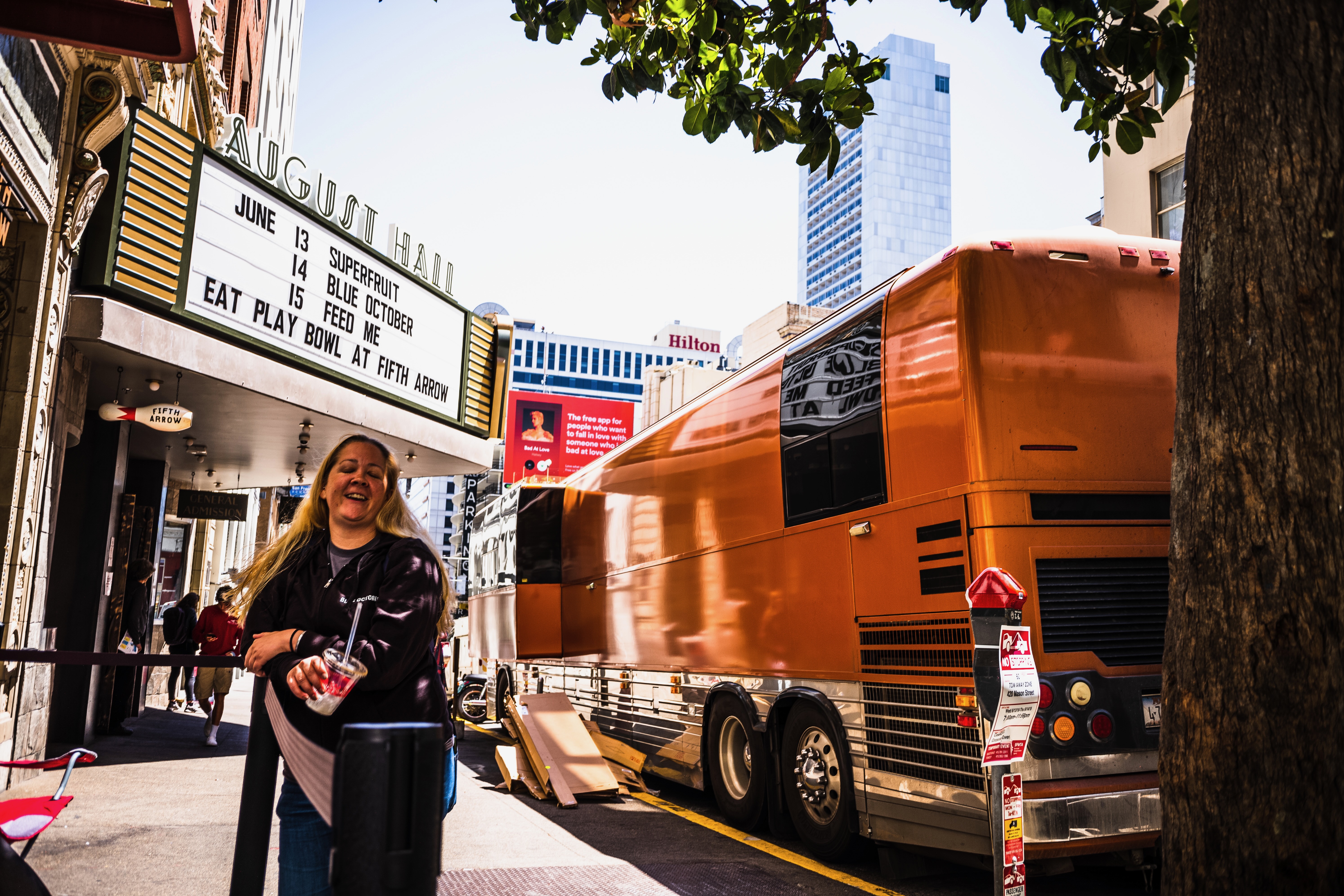 The photograph captures a lively street scene in front of August Hall, where a cheerful woman holds a drink, radiating joy. A large orange tour bus looms in the background, adding a sense of motion and excitement to the urban setting, illuminated by bright sunshine filtering through nearby trees. The combination of vibrant colors and the woman's smile creates a warm and inviting atmosphere, embodying the spirit of the city.