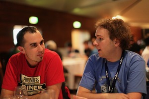 In a warm, softly lit restaurant, two men converse intently, their expressions revealing curiosity and camaraderie. The cozy ambiance is accentuated by the blurred background, emphasizing their connection amidst the lively setting. The contrast between the red and blue shirts adds a playful touch to the thoughtful exchange.