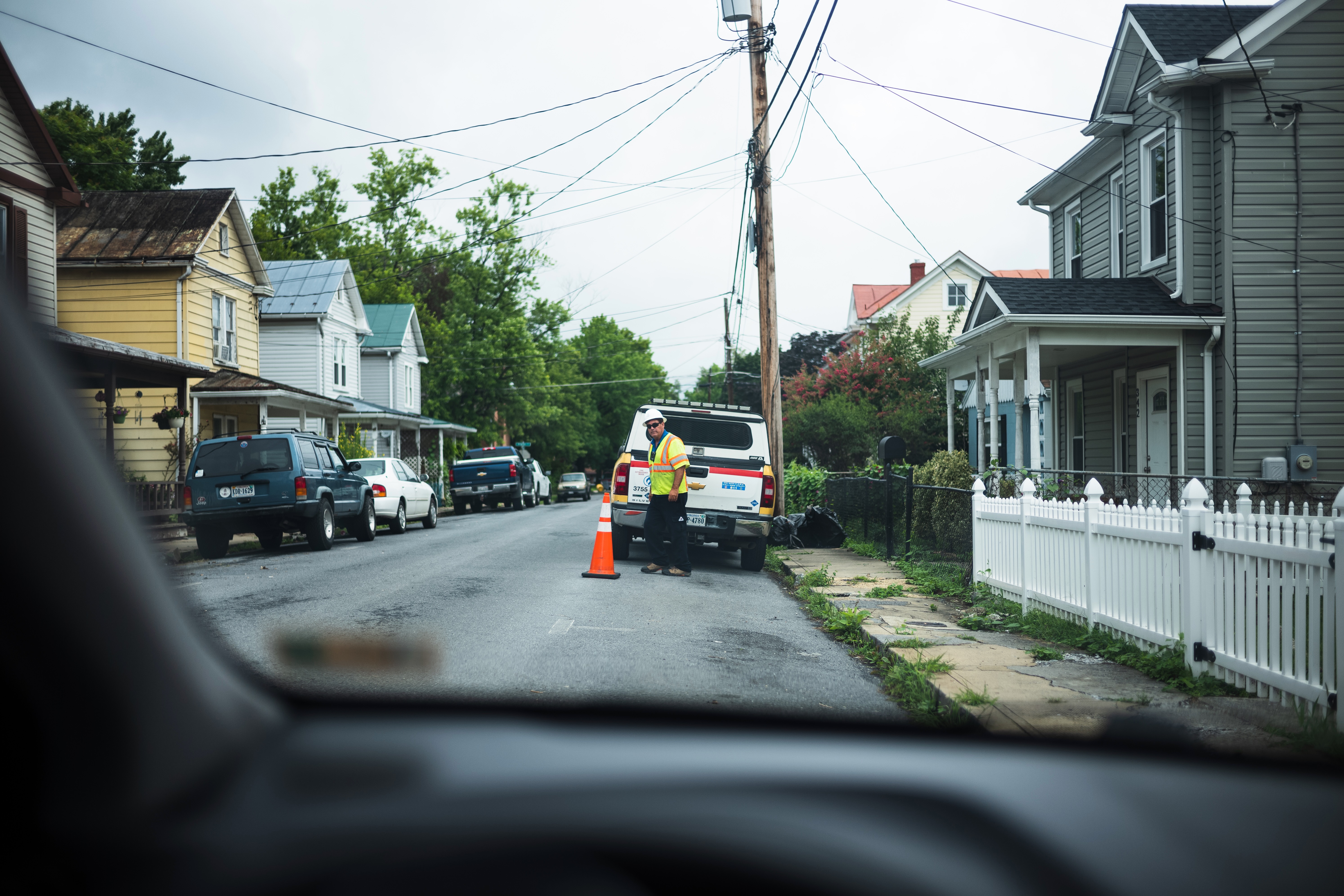 This photograph captures a quiet residential street under a muted, overcast sky. A worker in a safety vest stands beside a marked vehicle, with a traffic cone signifying a temporary disruption in the otherwise serene neighborhood. The composition highlights the contrast between the everyday life of the homes and the subtle interruption of routine, evoking a sense of calm alongside a hint of anticipation.