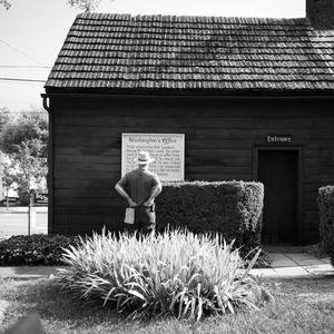 A solitary figure stands with hands clasped behind his back, engrossed in the historical plaque detailing George Washington's use of the building. The monochromatic tones evoke a timeless mood, while the soft light casts gentle shadows on the rustic wooden structure, accentuating its age. Lush greenery frames the scene, contrasting the simplicity of the man's attire and inviting contemplation on the past.