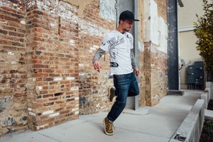 A young man is captured mid-step against a backdrop of textured brick and muted architectural lines, embodying a blend of casual style and urban energy. The mixture of soft, natural light and the steady shadows enhances the gritty charm of the setting, while his focused expression suggests a moment of deliberate motion. The composition juxtaposes street fashion with the rawness of the environment, creating a striking visual narrative.
