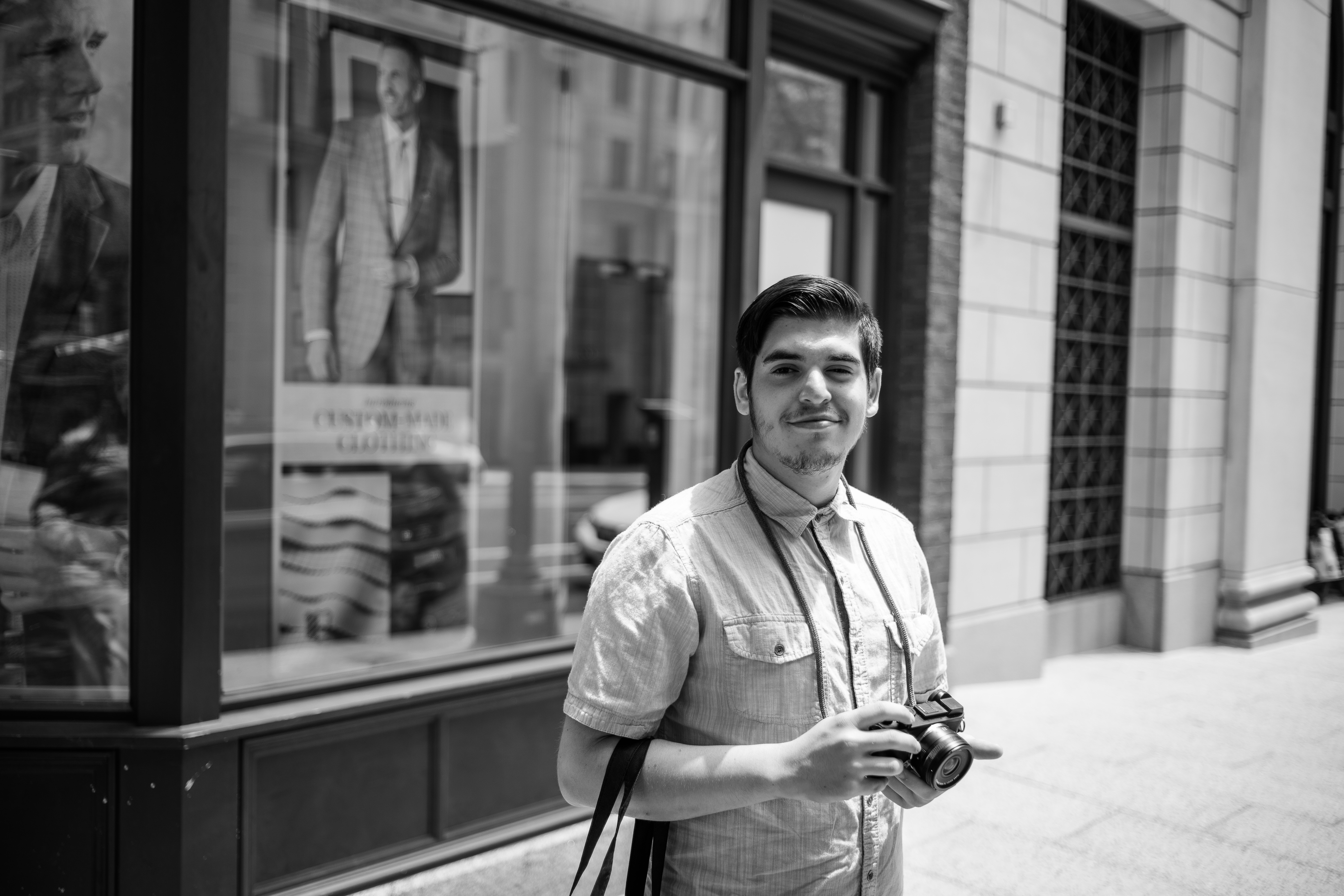 In a lively city setting, a young man stands confidently with a camera in hand, facing the viewer with a warm smile. The composition is marked by the contrast of natural light and shadows, while the monochrome aesthetic enhances the urban atmosphere. Reflections and advertisements in the background add a layer of storytelling to this candid moment.