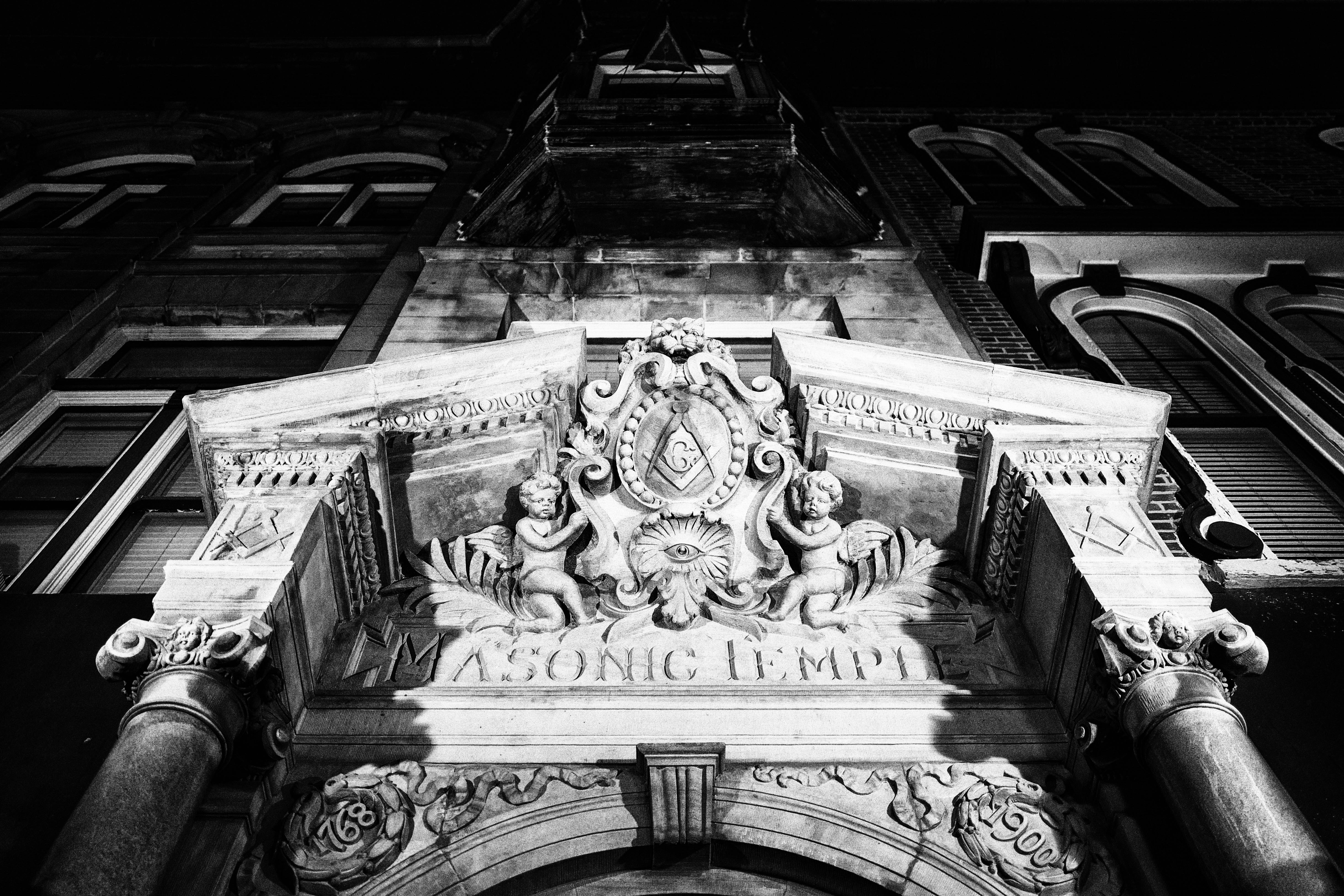 The photograph captures the grand entrance of a Masonic temple, illuminated against the darkness of night. The upward perspective emphasizes the architectural details and ornate carvings, evoking an air of mystery and reverence. High contrast black and white tones enhance the dramatic mood, highlighting both the age and significance of the building.