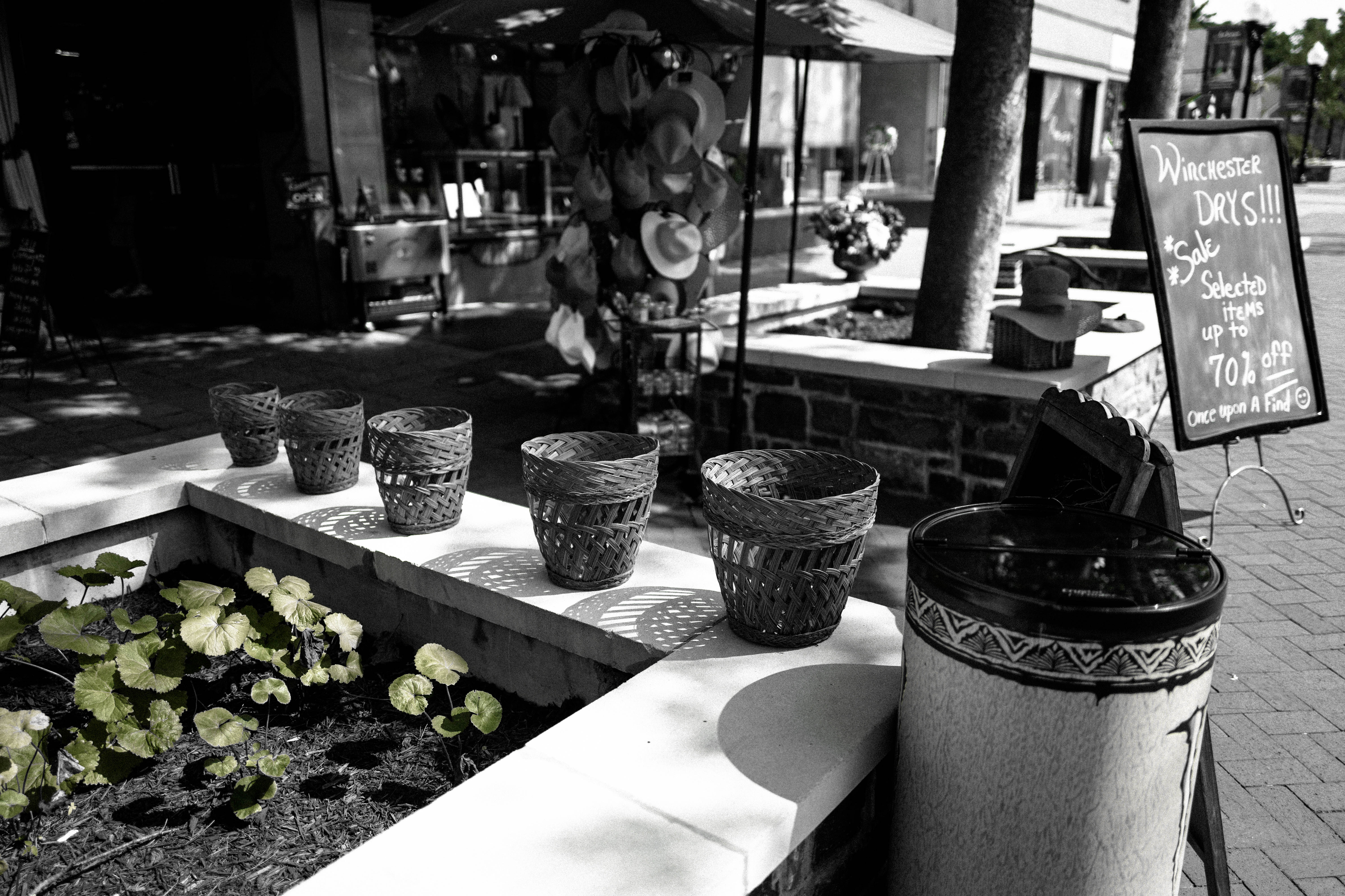 This monochromatic photograph captures a serene outdoor scene, featuring a row of woven baskets placed along a stone ledge. The light filters gently through nearby trees, creating intricate shadows and a relaxed ambiance, while the simple composition draws attention to both the texture of the baskets and the contrasting greenery. A nearby sign hints at an inviting sale, adding a touch of urban charm to the otherwise calm setting.