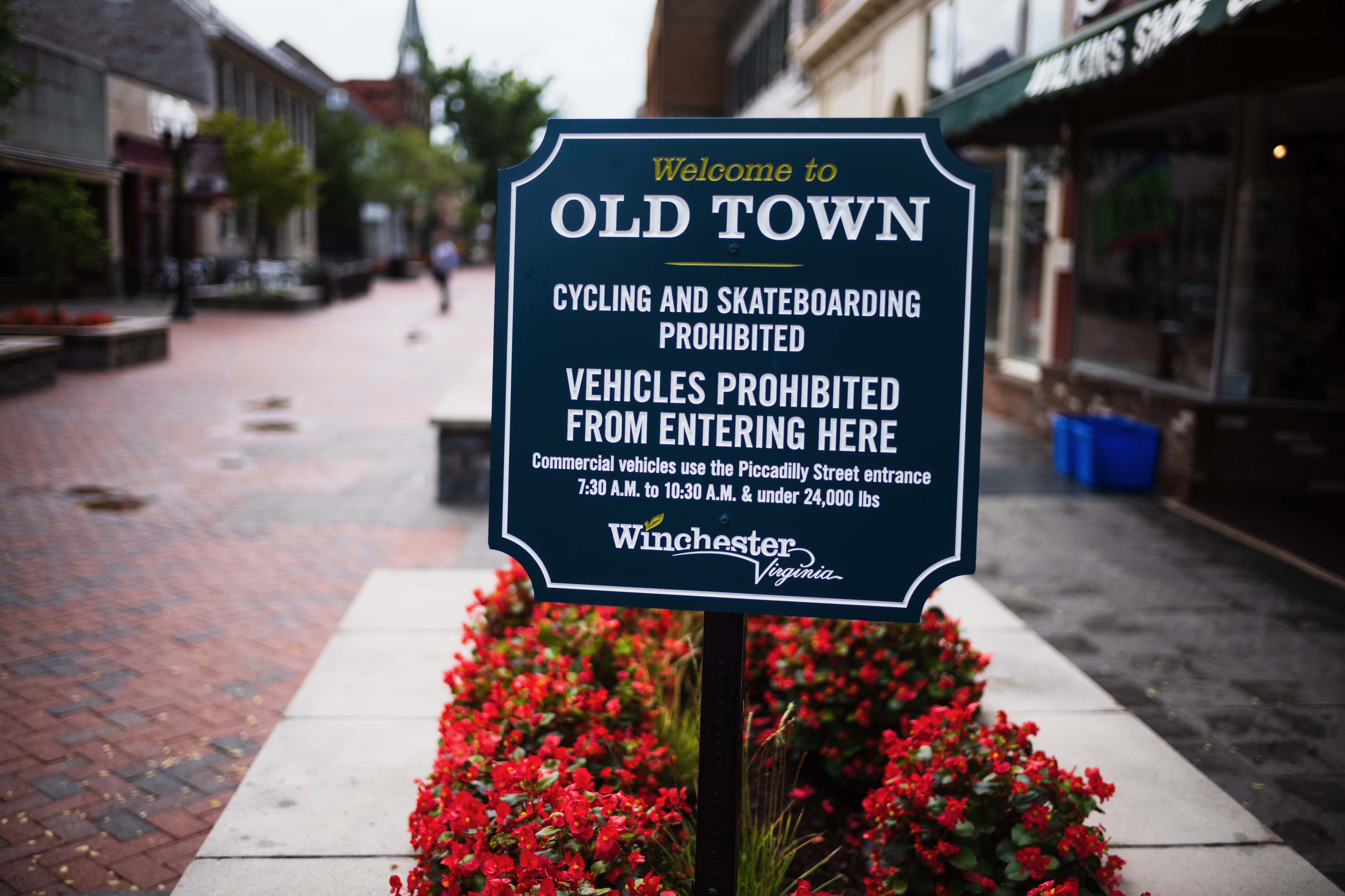 The photograph captures a charming street scene in Old Town Winchester, Virginia, highlighted by a prominently placed sign. The mood is inviting yet serene, with soft lighting enhancing the vibrant red flowers at the base of the sign. Cobblestone paths and quaint shops line the background, suggesting a blend of historic charm and modern regulations.