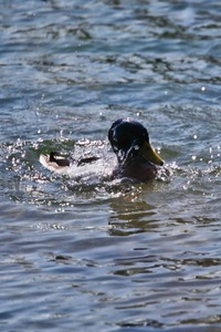 A vibrant mallard duck glides gracefully through shimmering water, creating delicate splashes that catch the sunlight. The soft, reflective surface contrasts with the lively energy of the duck, evoking a sense of tranquility. The rich tones of the duck's plumage are highlighted by the crystal-clear light, emphasizing its natural beauty in a moment of serene immersion in nature.