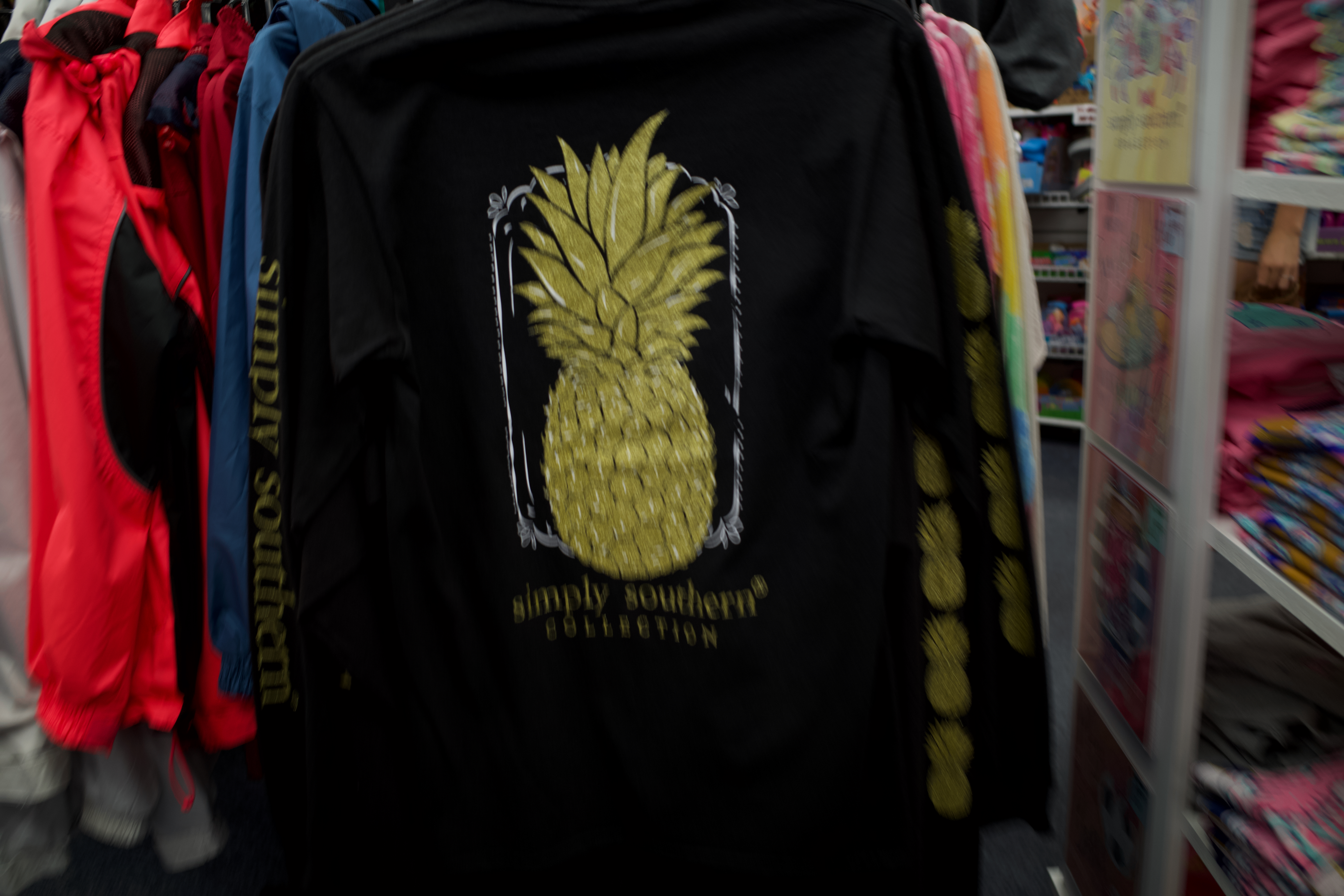 The photograph captures a black long-sleeve shirt adorned with a vibrant, golden pineapple design, drawing attention amidst a colorful array of clothing. Soft, diffused lighting casts a casual, inviting atmosphere, enhancing the playful spirit of the piece. The composition highlights the shirt's unique character while hinting at the diversity of styles around it, set within an engaging retail environment.