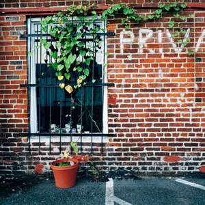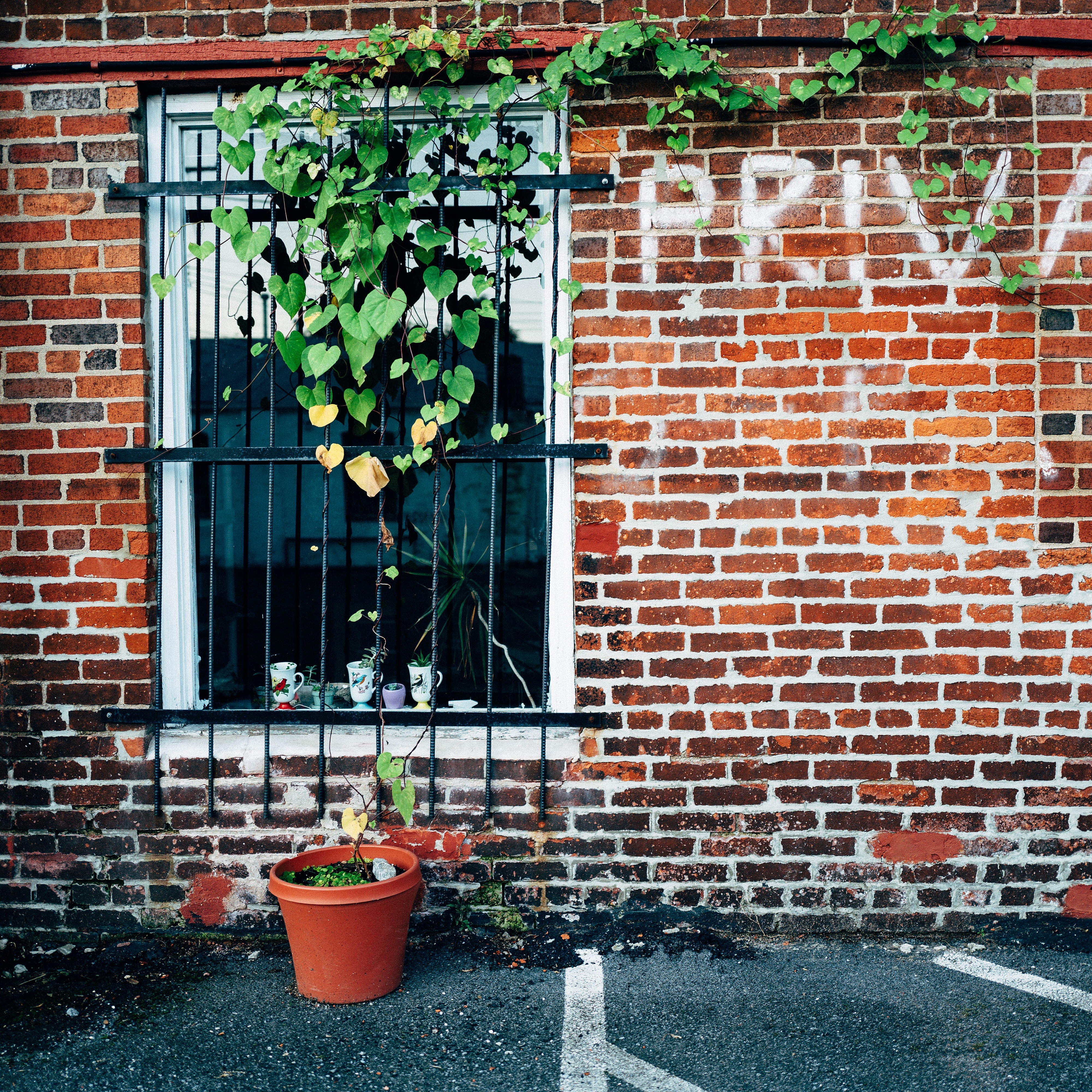 This photograph captures a vibrant interplay between nature and urbanity, featuring a weathered brick wall adorned with lush green vines cascading down a barred window. The warm tones of the brick contrast with the verdant leaves, creating a mood of quiet resilience and beauty against a backdrop of confinement. Soft natural light gently illuminates the scene, enhancing the textures and inviting a sense of contemplation.