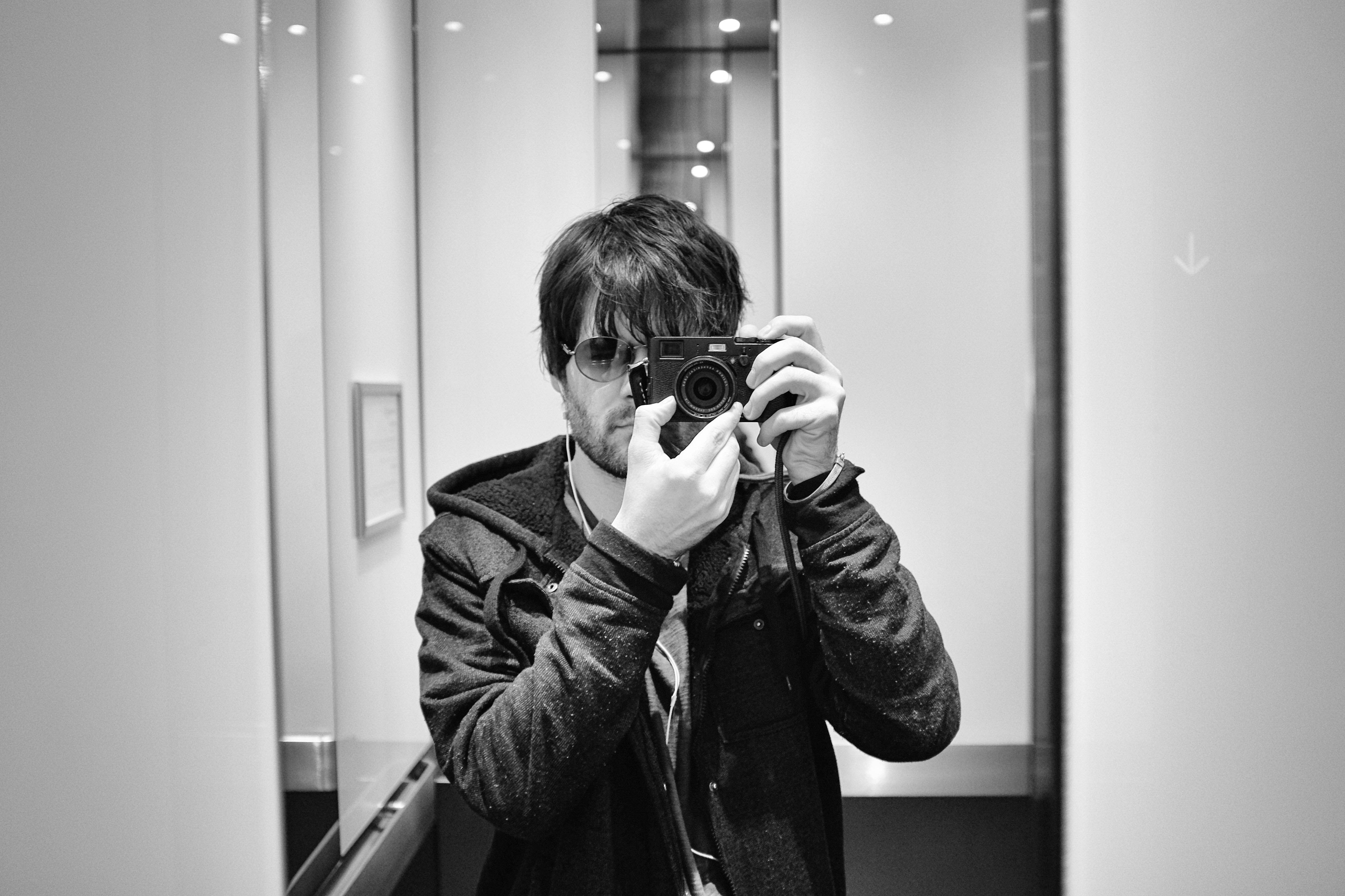 In a haunting black-and-white photograph, a young man in sunglasses captures his reflection while holding a camera, creating a dialogue between observer and subject. The polished elevator walls amplify the stark contrast of shadows and light, lending an introspective, almost cinematic mood to the moment. The composition, framed symmetrically, draws the viewer into a shared experience of fleeting self-awareness.