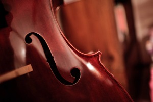 This close-up photograph captures the elegant curves of a cello, highlighting its rich wood grain and intricate f-hole design. Soft, warm lighting envelops the instrument, creating an inviting atmosphere that evokes a sense of intimacy and nostalgia. The blurred background adds to the overall mood, suggesting a quiet space where music resides and resonates.