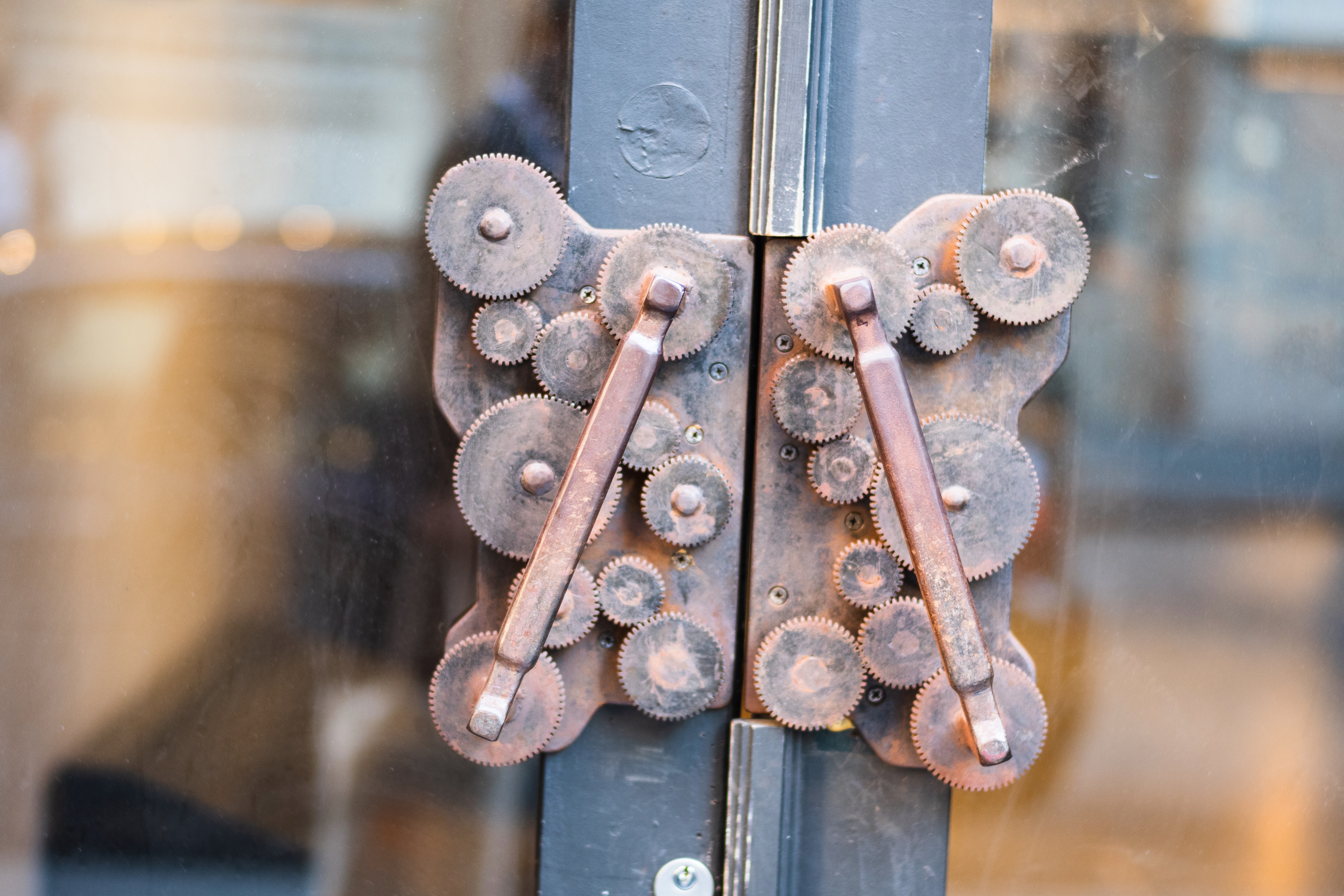 The photograph captures a striking door hinge intricately designed with a series of interlocking gears, evoking a sense of industrial charm. Soft, ambient lighting enhances the warm patina of the metal, creating a nostalgic mood. The composition draws the eye to the detailed craftsmanship, highlighting the harmonious blend of functionality and artistry.