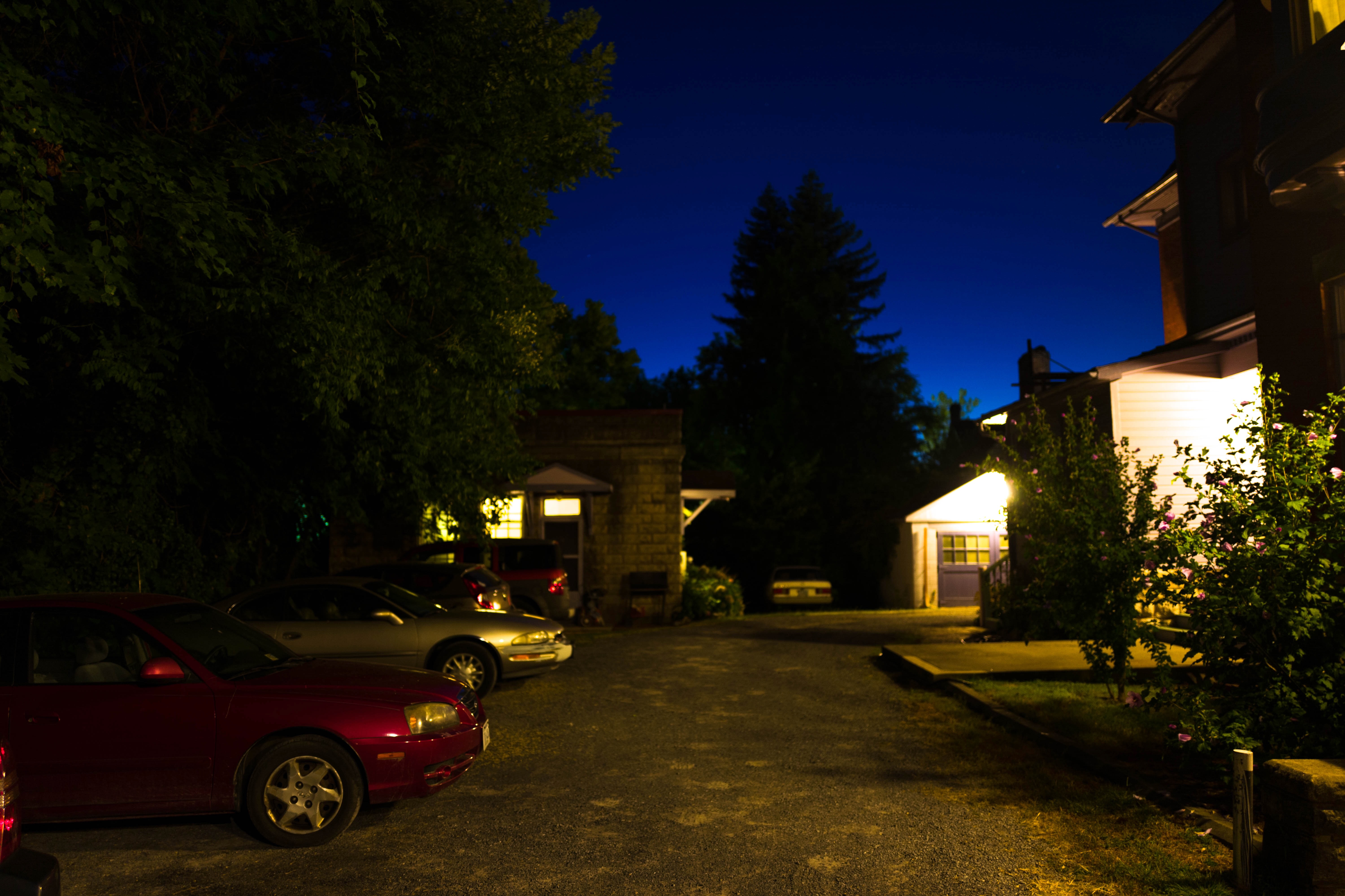 A serene nighttime scene captures a gravel parking area illuminated by artificial lights, contrasting with the deepening blue sky. The composition balances shadows of tall trees and the warm glow from nearby buildings, creating a tranquil yet inviting mood. Cars are parked casually, suggesting a sense of calm and familiarity in this secluded setting.
