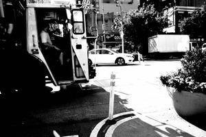 The photograph captures a moment of stillness amidst the bustling city, featuring a man seated in the open door of a large vehicle, engaging in a gesture that suggests communication or contemplation. The high-contrast black-and-white composition emphasizes the interplay of light and shadow, enhancing the urban atmosphere, while the surrounding vehicles and greenery add depth to the scene. The mood is one of quiet observation, offering a glimpse into the rhythm of city life.