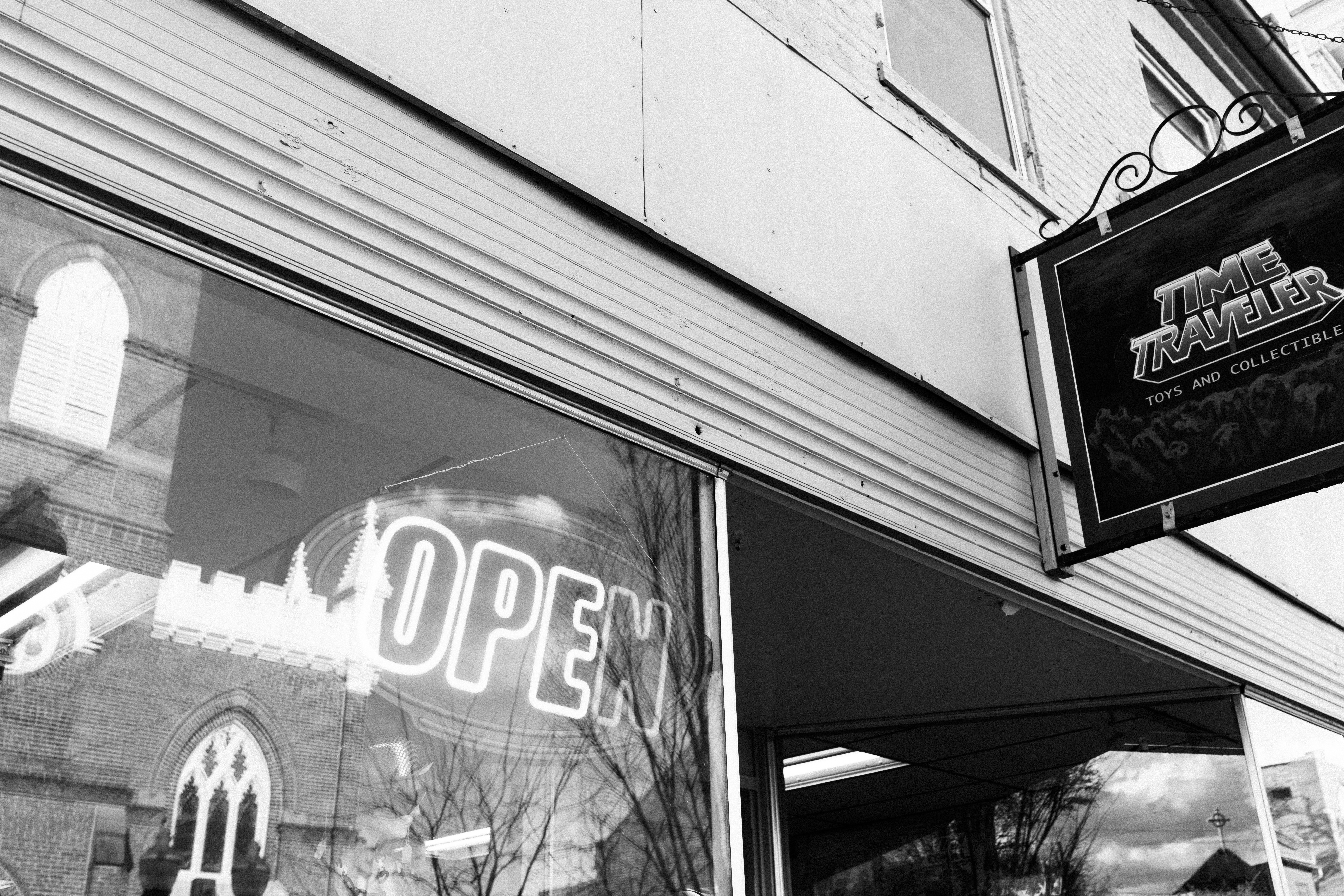 This black and white photograph captures the storefront of a toy and collectibles shop named 'Time Traveler,' with a bright 'OPEN' sign glowing vibrantly in the reflection. The composition is angled to highlight the interplay between the inviting neon and the vintage architecture in the background, creating a sense of nostalgia and curiosity. Soft natural light enhances the scene, inviting passersby to explore the treasures within while evoking a timeless charm.