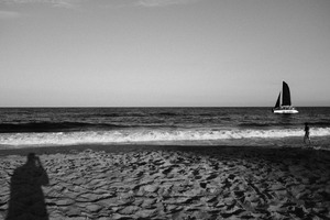 A tranquil black-and-white scene captures the vastness of the ocean as a sleek sailboat glides effortlessly across the horizon. The soft waves lap gently at the shore, while a solitary figure walks along the beach, casting a long shadow in the sand. The mood is contemplative and calm, illuminated by soft natural light that enhances the tranquility of the moment.