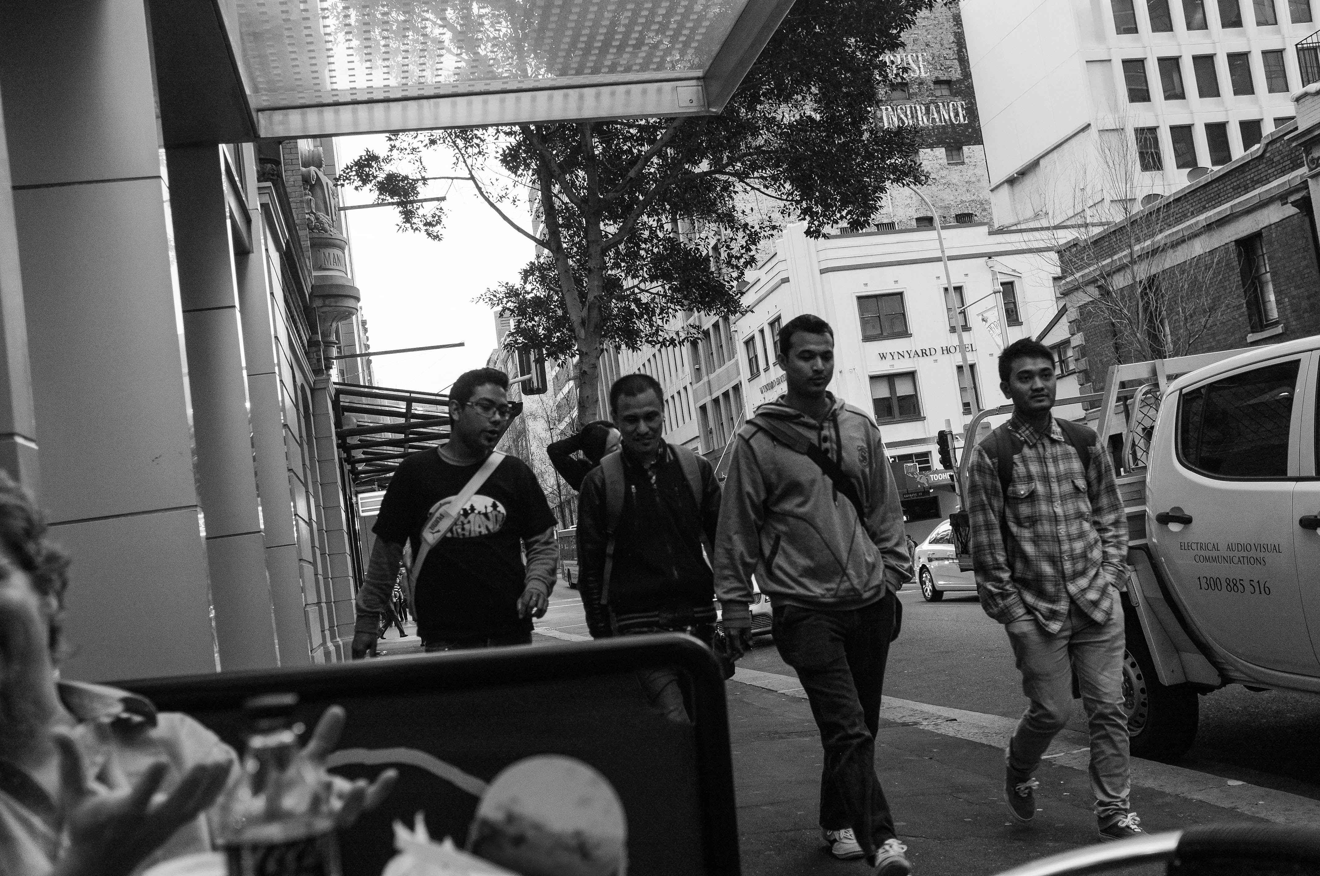 In this monochrome photograph, a group of four young men strides purposefully down a bustling city sidewalk. The atmosphere is casual yet energetic, with the harsh lighting casting defined shadows that accentuate the architecture and their expressions. Captured from a low angle, the scene offers a glimpse into urban life, hinting at both connection and individuality among the passersby.