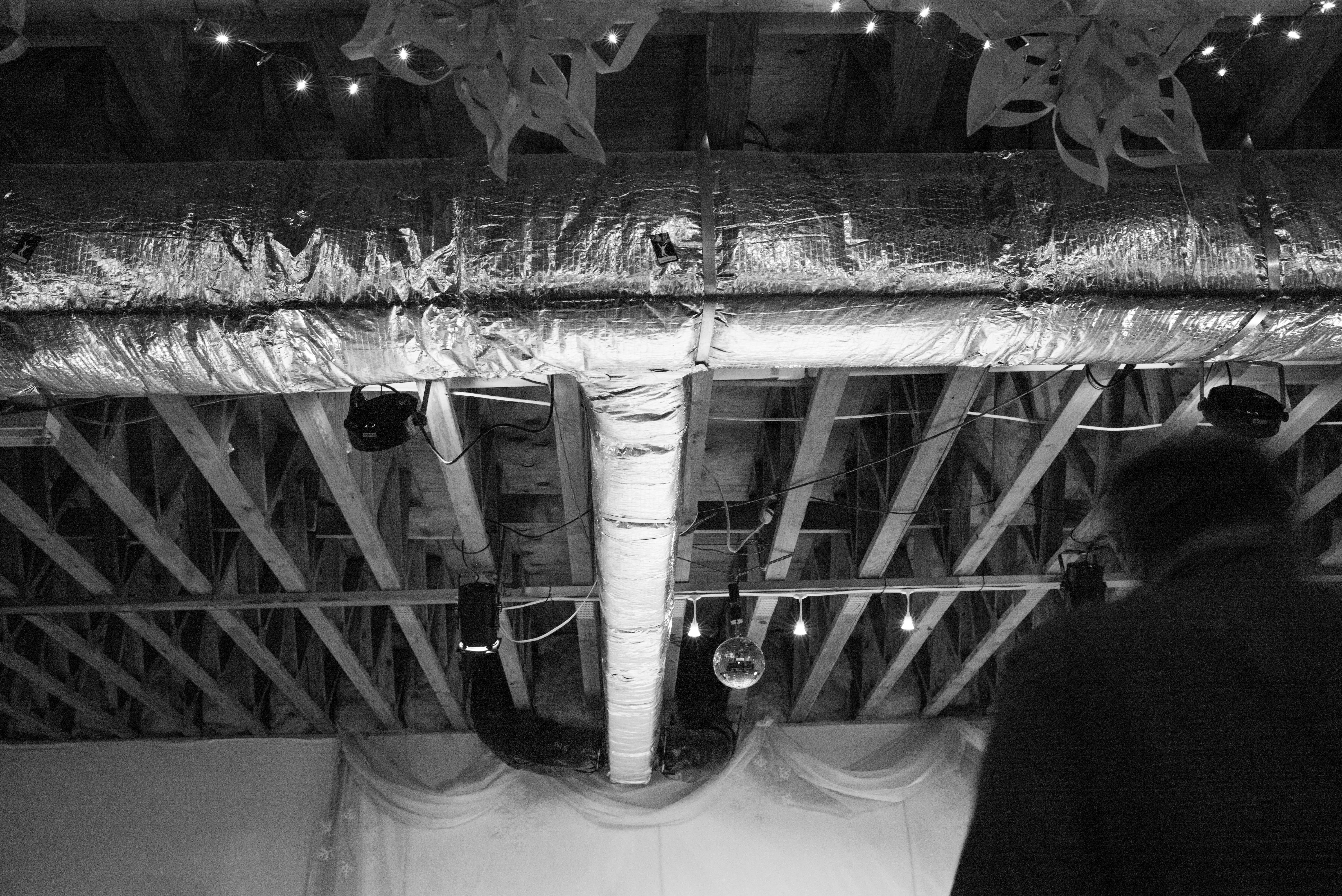 This photograph captures an upward view of a rustic ceiling, featuring metallic ductwork and wooden beams, creating a juxtaposition of industrial and warm elements. The ambient lighting, accentuated by a disco ball, casts a soft glow, enhancing a nostalgic and intimate mood. The blurred figure in the foreground suggests quiet movement, inviting a sense of mystery to the scene.