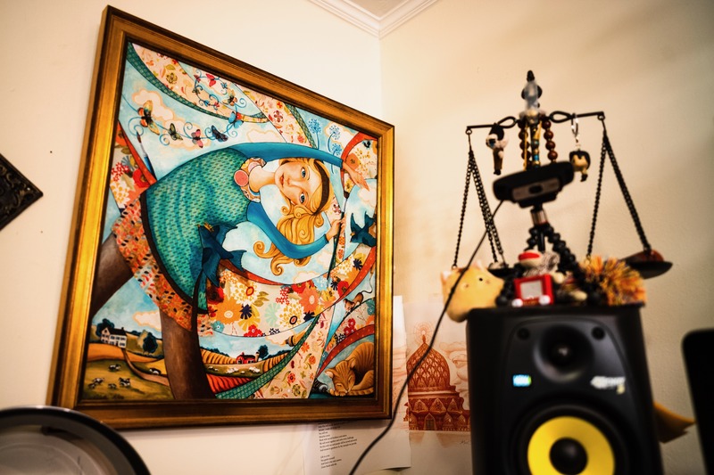 The photograph captures a vibrant, whimsical painting of a girl cradling her head in a dreamy landscape, adorned with swirling floral patterns and birds. The warm lighting and rich colors radiate a sense of comfort and enchantment, creating a cozy atmosphere within the room. In the foreground, a speaker and decorative items add layers of interest and context to the scene, blending art and environment harmoniously.