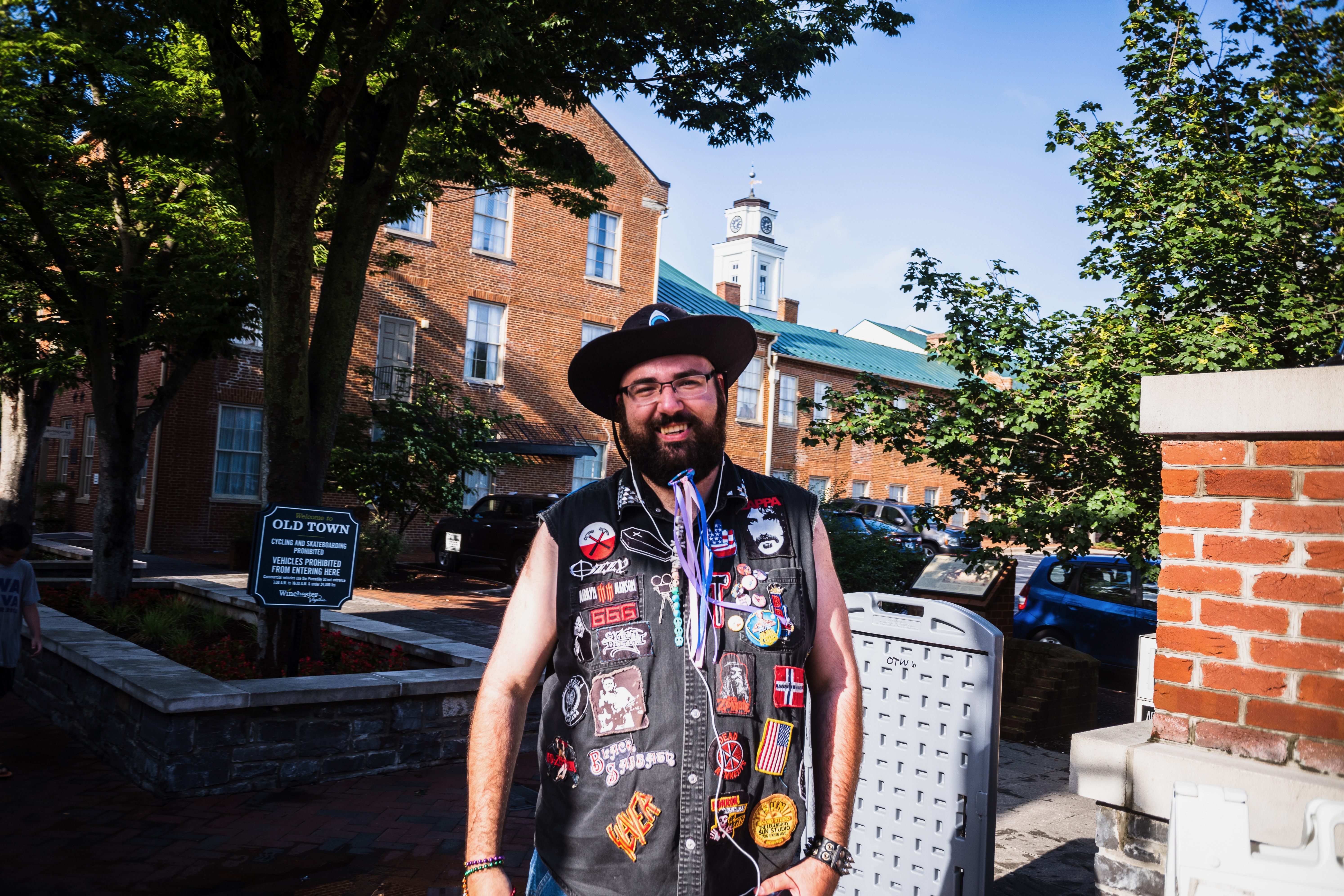 In this vibrant photograph, a man proudly displays his eclectic personality adorned with patches and pins on a sleeveless vest, standing against a backdrop of historical buildings. The warm sunlight casts a positive glow, enhancing his cheerful demeanor and the lush greenery surrounding him. The composition blends urban charm with individual expression, inviting viewers to explore the convergence of personal style and community atmosphere.