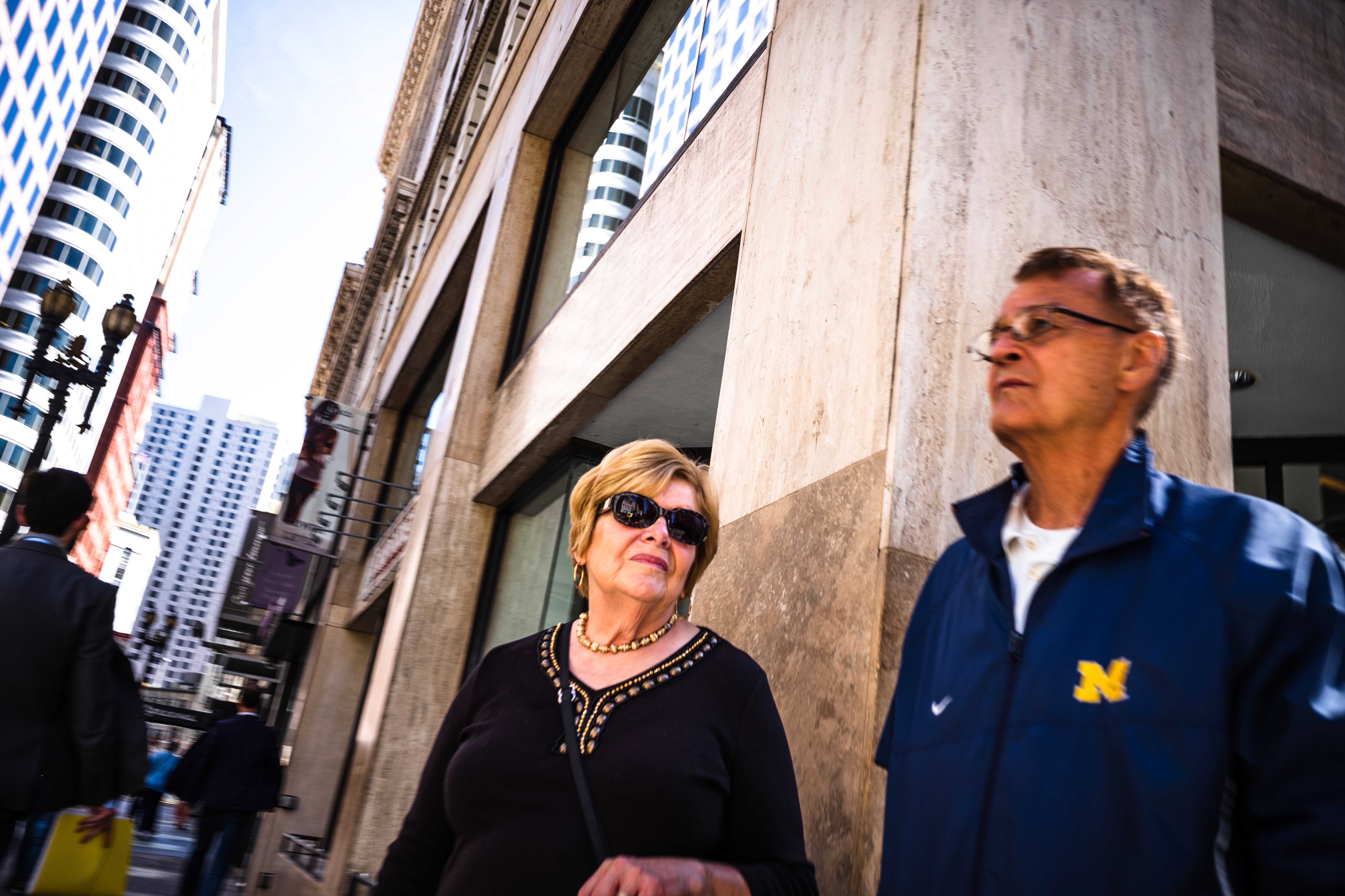 The photograph captures an elderly couple strolling through a bustling city environment, framed by towering glass buildings that reflect the urban landscape. Soft, natural light enhances the warm tones of their attire while casting gentle shadows, creating a sense of intimacy amidst the lively surroundings. The composition draws the viewer in, inviting them to reflect on the connection and stories shared between the couple amid the city's vibrant atmosphere.