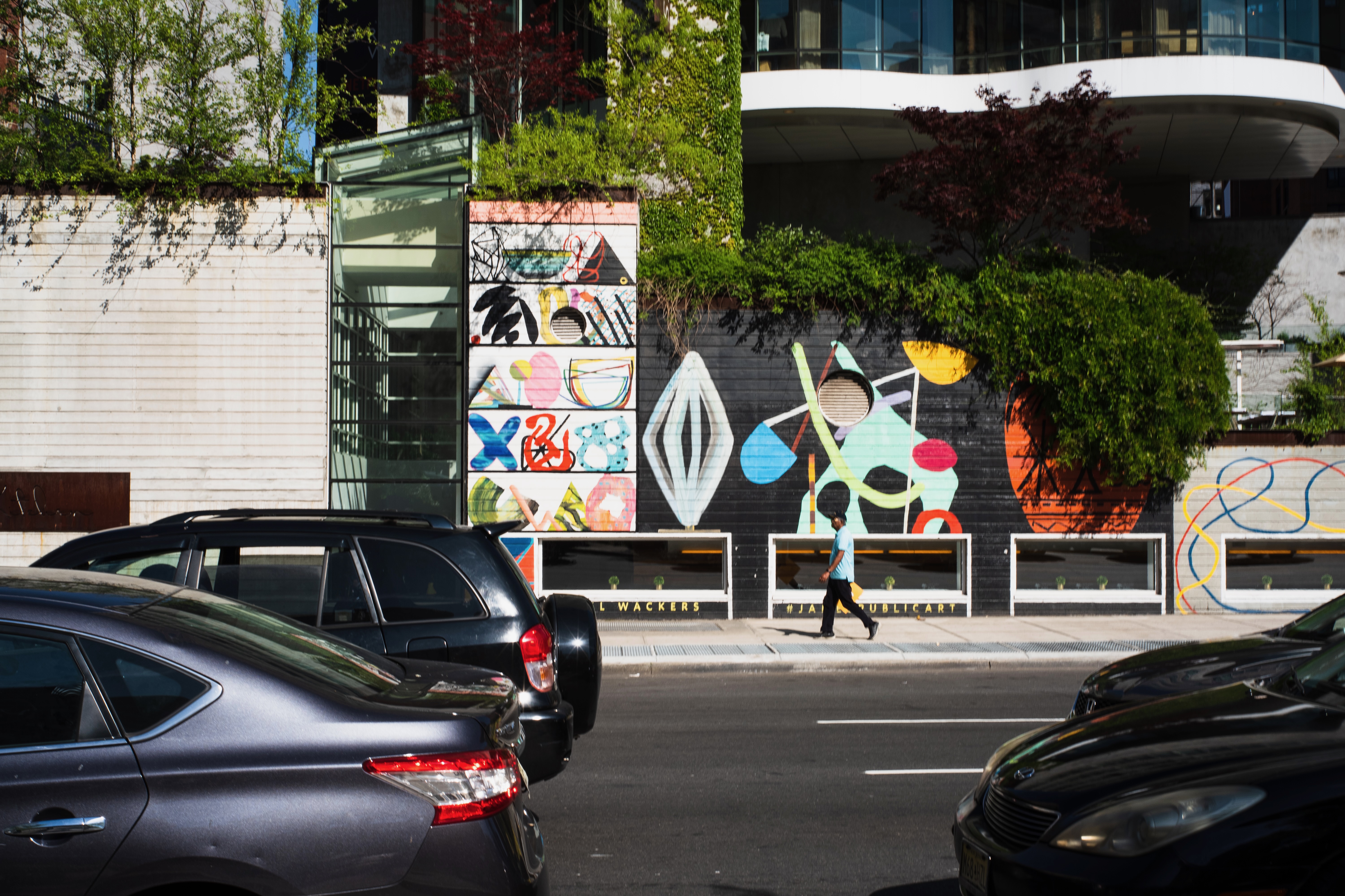 In this vibrant urban scene, a pedestrian strolls past a colorful mural, infused with artistic patterns and lively shapes. The composition captures a dynamic contrast between the modern cityscape and the expressive street art, enhanced by bright sunlight that casts playful shadows. The mood is lively and energetic, reflecting the pulse of city life amid the backdrop of parked cars and greenery.