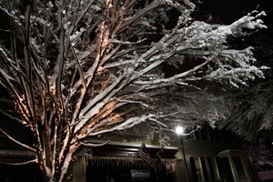 This enchanting photograph captures a snow-laden tree adorned with twinkling lights, creating a warm contrast against the chilly night. The soft glow of the lights and lamppost add a magical ambiance, while the shadowy building in the background enhances the serene, wintery mood. The composition draws the eye upward, emphasizing the tactile beauty of snow-covered branches against the dark sky.
