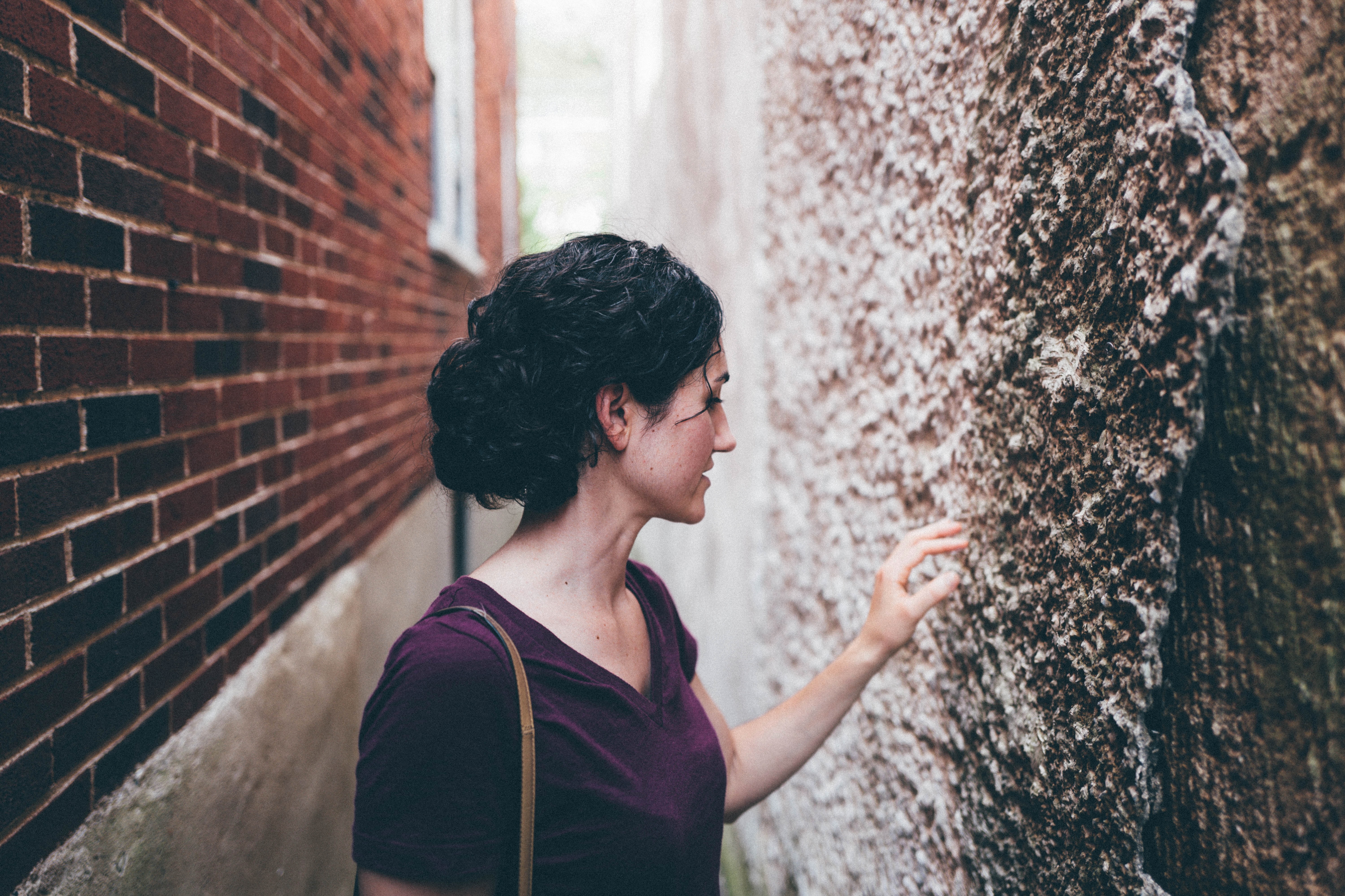 In a narrow alleyway, a woman reaches out to touch a rough, textured wall, her profile softly illuminated by natural light filtering through nearby windows. The mix of brick and stone creates a juxtaposition that emphasizes the urban setting, while her contemplative expression suggests a moment of introspection. The mood is serene and reflective, inviting viewers to ponder the connection between the individual and their environment.