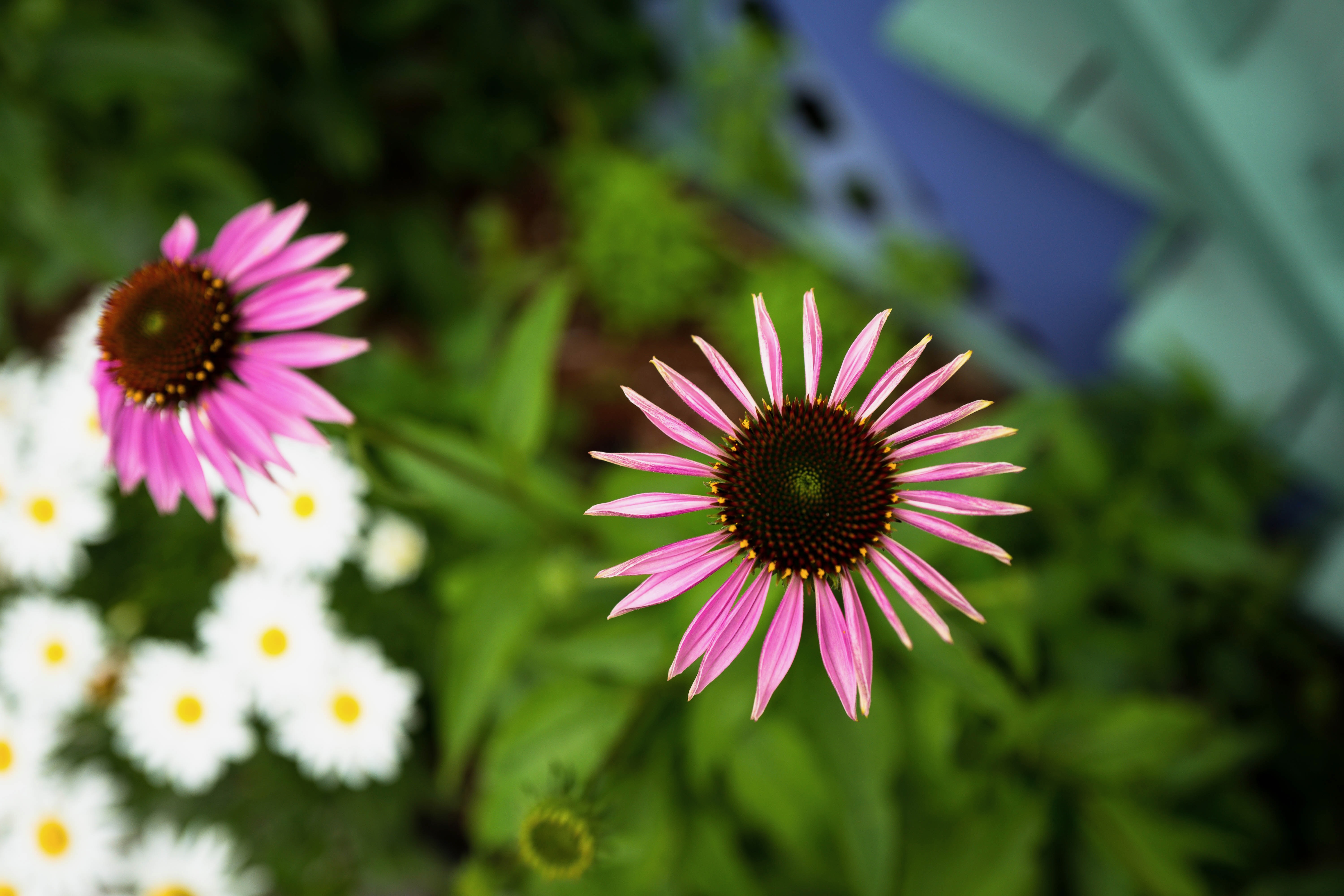 In a vibrant garden, two echinacea flowers with striking pink petals capture the viewer's gaze, surrounded by lush greenery and hints of white daisies. The soft, diffused lighting enhances the floral colors, evoking a serene and inviting mood. The composition draws attention to the intricate details of the petals and central cone, creating a harmonious balance within the natural setting.