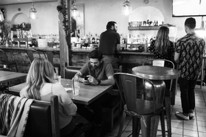This black-and-white photograph captures the intimate atmosphere of a lively bar scene. The focused subject sits absorbed in his phone while two others engage at the bar in the background, creating a contrast between solitude and camaraderie. Soft lighting from overhead fixtures accentuates the playful shadows, enhancing the mood of quiet reflection amidst social warmth.