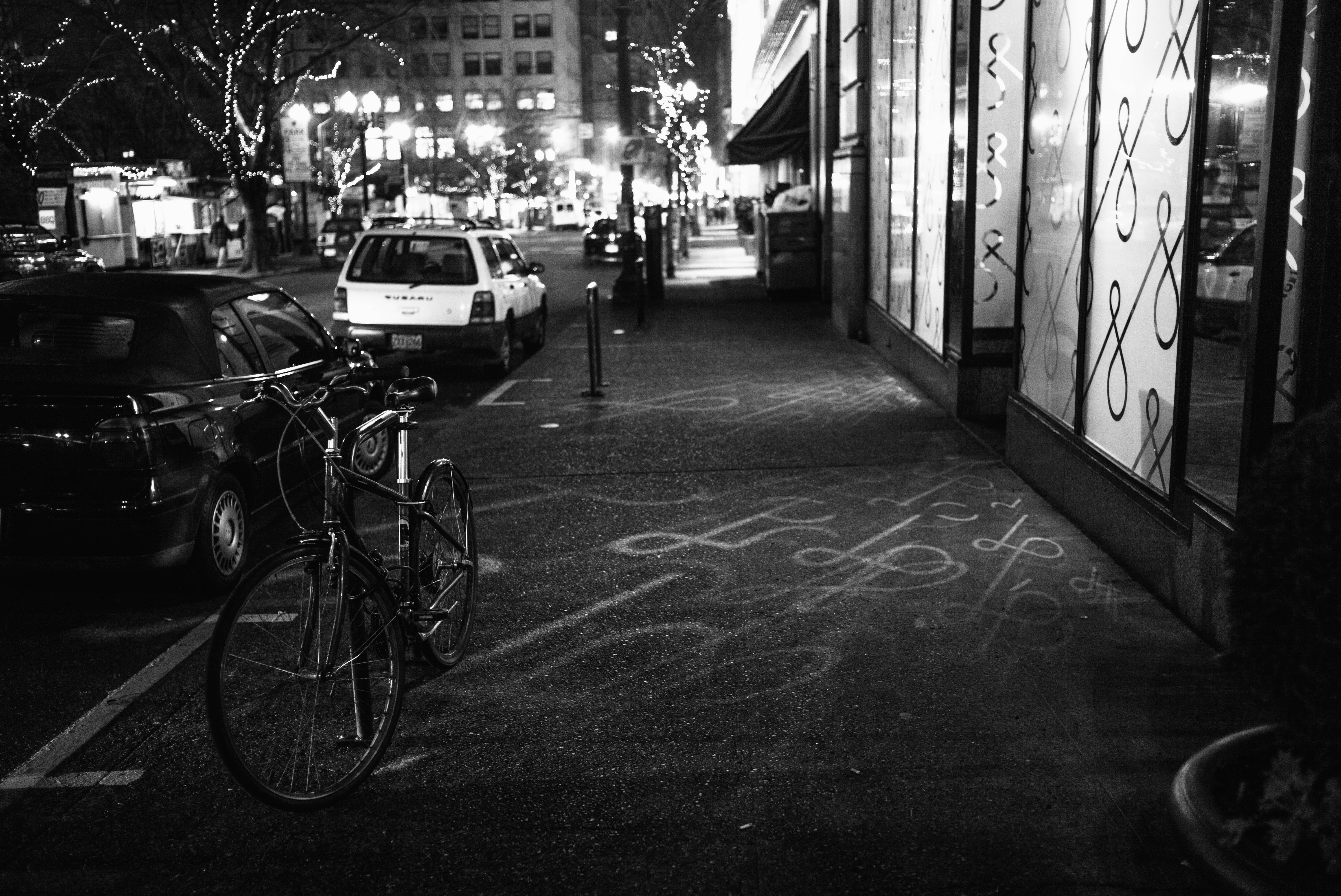 A solitary bicycle rests on the sidewalk, casting a nostalgic presence against the bustling city background. Soft, ambient lighting from nearby storefronts reflects off the pavement, illuminating abstract shadows that dance around it. The overall mood is serene yet vibrant, evoking a sense of peaceful solitude in the lively urban environment.
