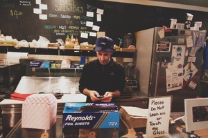 In a cozy bagel shop, a focused worker checks his phone amidst the hustle of food preparation. The dim lighting casts a warm glow over the scene, highlighting the handwritten menu and cluttered counter, creating an intimate atmosphere. The juxtaposition of everyday tasks and personal moments captures the essence of a lively yet serene eatery.
