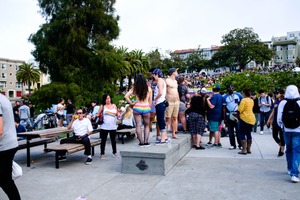 The photograph captures a lively scene in a park, filled with a diverse crowd celebrating together. Bright colors and casual attire suggest a festive atmosphere, enhanced by natural light filtering through the trees, casting playful shadows. The composition draws the viewer's eye to the group on the stone platform, exuding a sense of community and joy amidst the larger gathering.