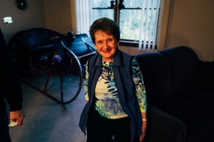 In a cozy living room, an elderly woman beams with a welcoming smile, exuding warmth and joy. Soft light streams through the window, highlighting her vibrant attire and casting gentle shadows across the room. Behind her, an antique carriage adds a nostalgic touch, enhancing the intimate and affectionate atmosphere of the scene.