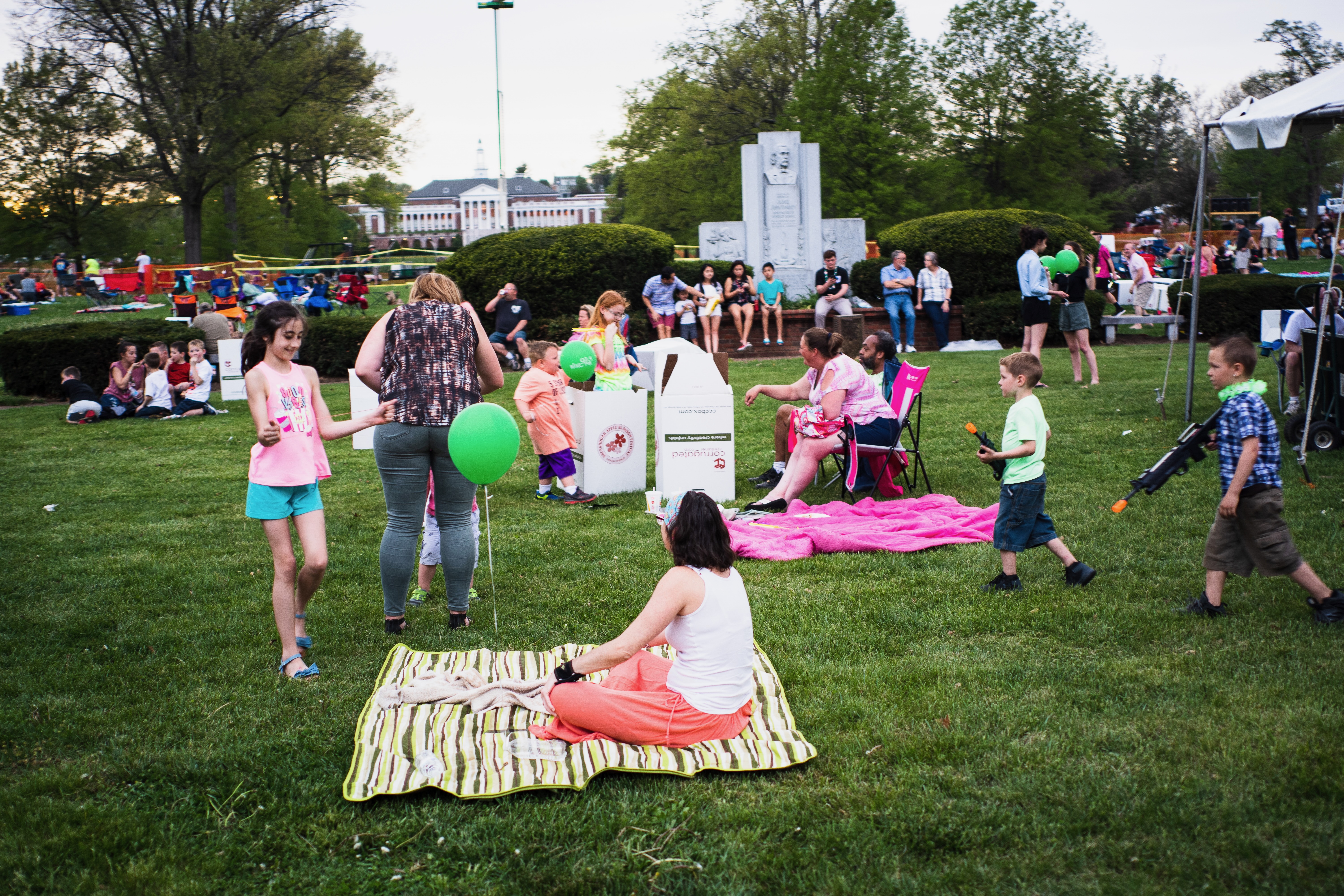 The photograph captures a lively park scene filled with families enjoying a festive outing. Children play with bright green balloons and engage in games, while adults relax on picnic blankets, embodying a vibrant, communal spirit. The soft evening light and green grass evoke a warm, inviting atmosphere of joy and togetherness.
