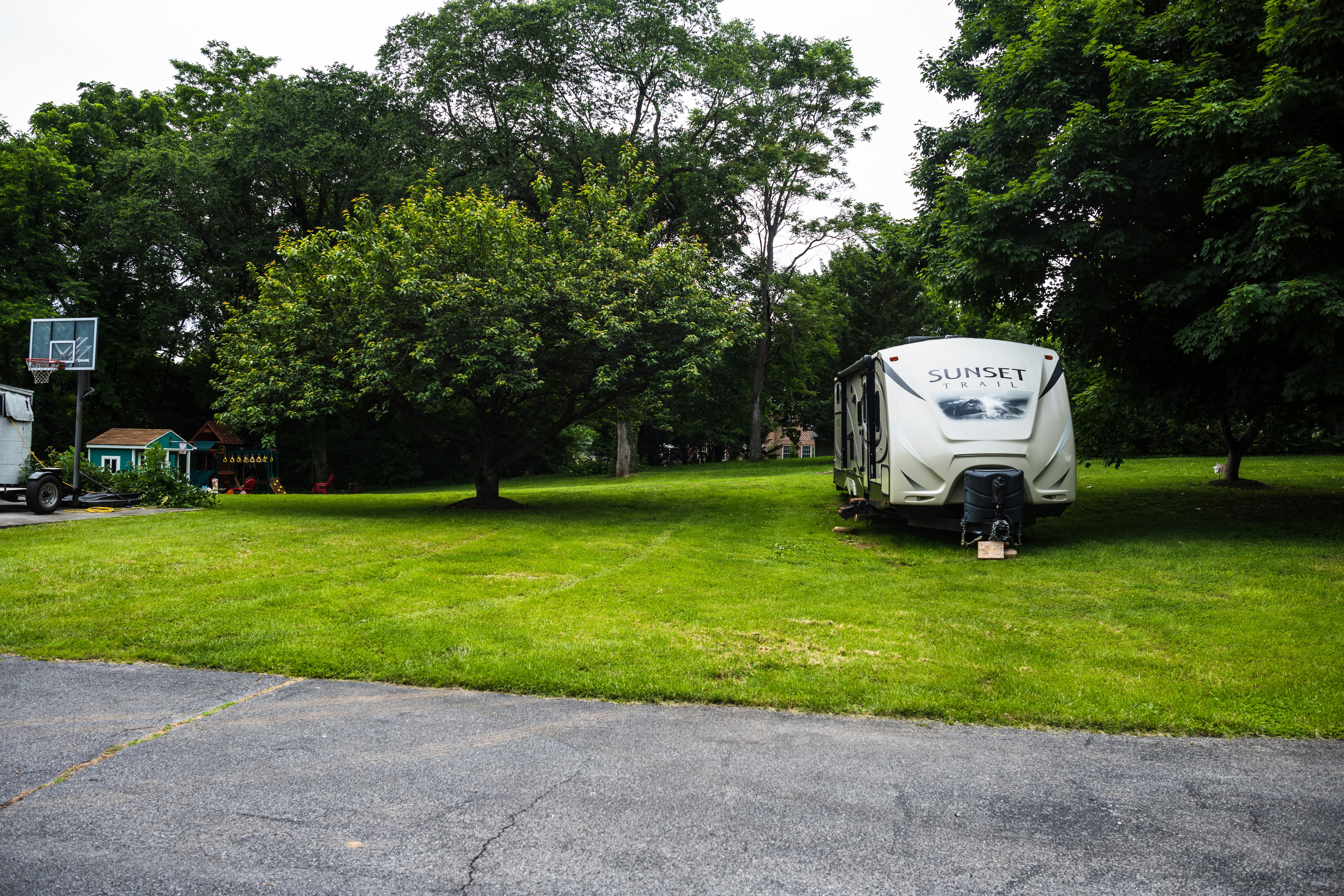The photograph captures a tranquil suburban scene, featuring a parked RV at the edge of a grassy expanse. Lush greenery surrounds the vehicle, enhancing the serene and inviting atmosphere, with soft, diffused light filtering through the trees. The composition balances natural elements with man-made structures, evoking a sense of leisure and nostalgia.