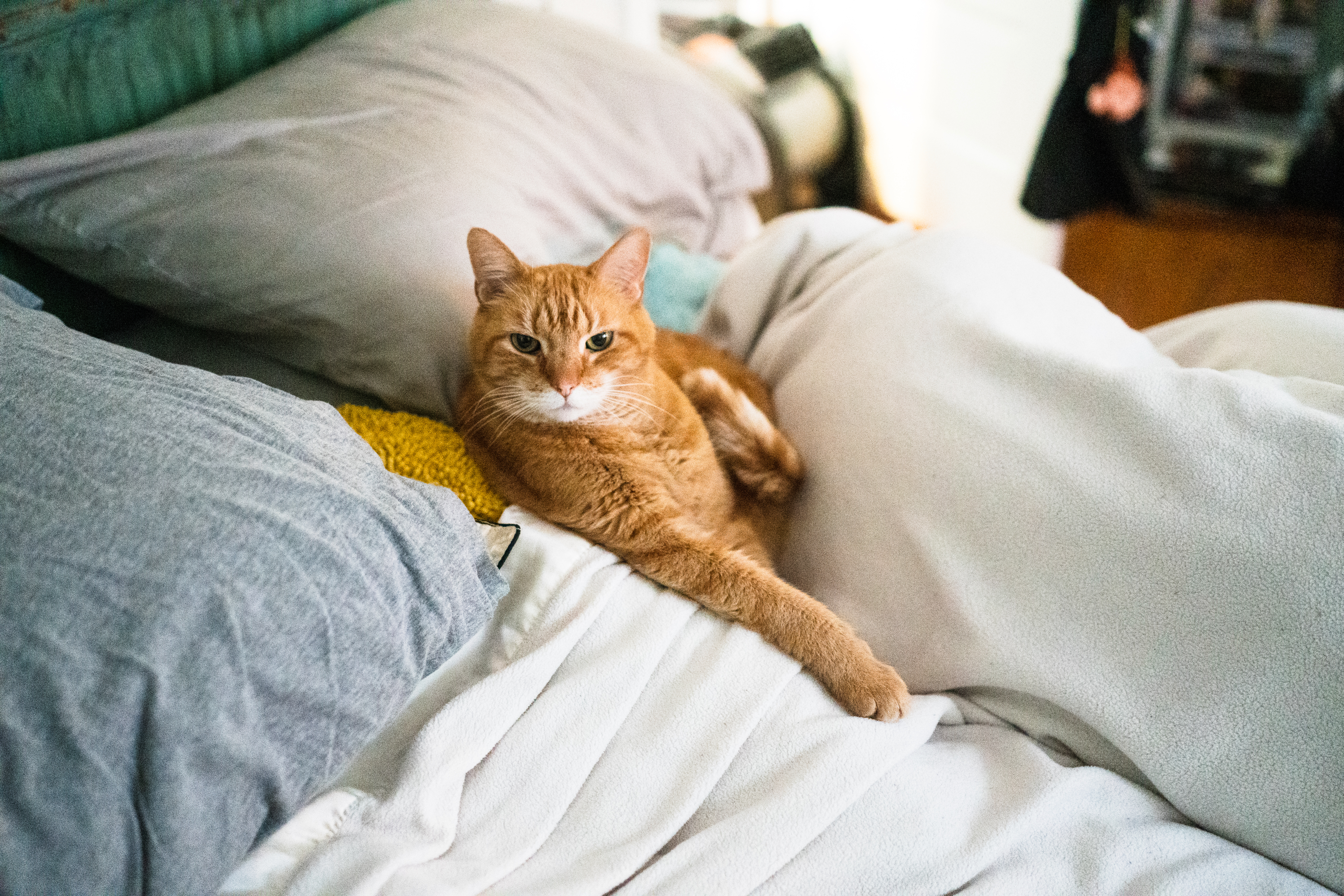 A relaxed orange cat reclines on a bed, surrounded by soft pillows and blankets, exuding an air of tranquility. The natural light softly illuminates the space, enhancing the cozy atmosphere, while the cat's piercing gaze invites calm and comfort. The composition captures the essence of a peaceful morning, where warmth and companionship take center stage.