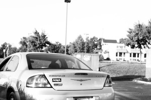 This black-and-white photograph captures the rear view of a Chrysler Sebring parked in an urban setting, subtly reflecting a sense of solitude and everyday life. The soft morning light creates gentle shadows, highlighting the car's contours and the simplicity of its surroundings, while the sticker on the bumper introduces an intriguing narrative of adaptation. The composition is balanced, centering the viewer's gaze on the vehicle, surrounded by trees and structures in the distance that lead the eye deeper into the scene.