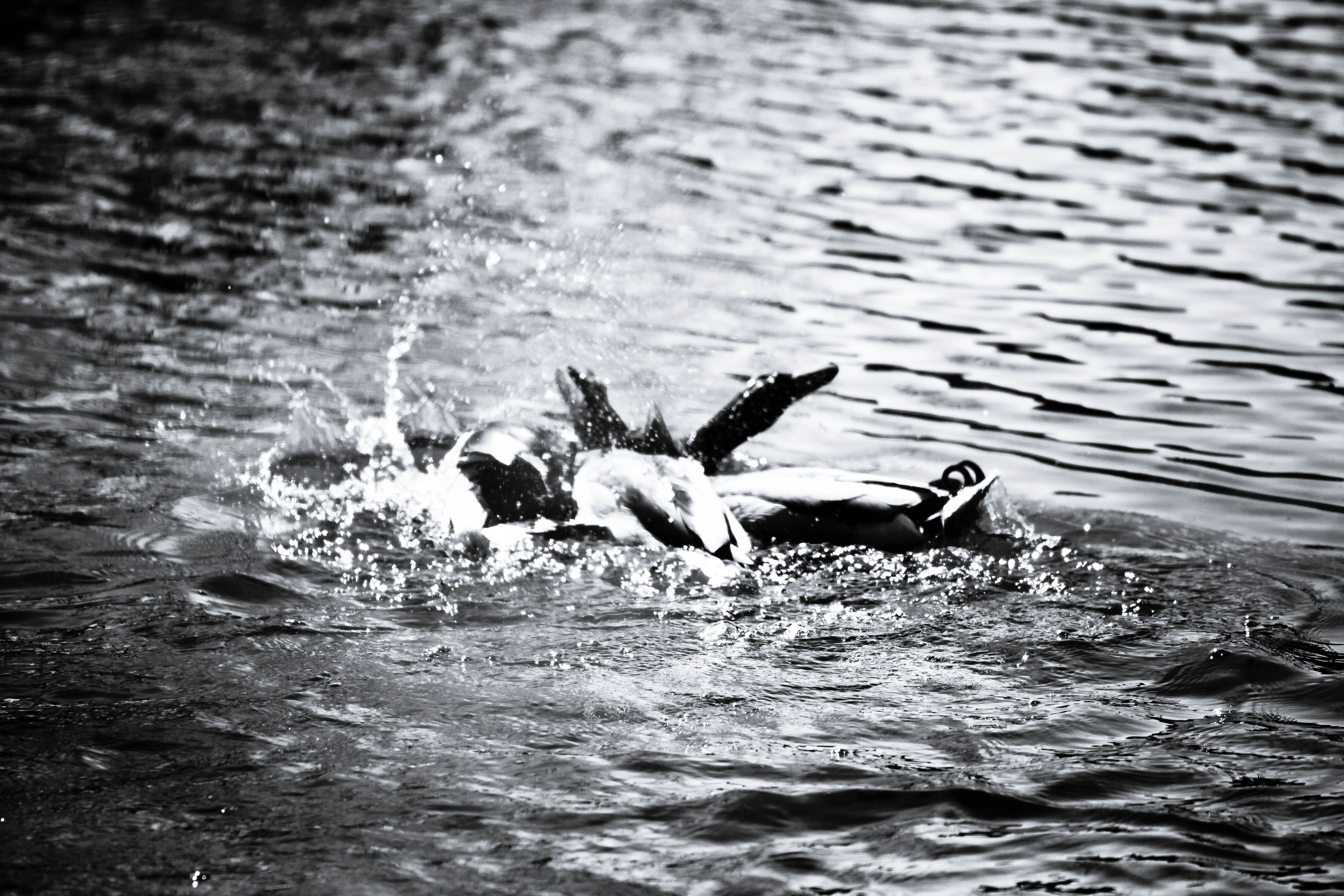 This striking black-and-white photograph captures the lively splashes of birds in a dance of chaos atop the shimmering water's surface. The contrast between the dark silhouettes and the light reflections creates a dramatic mood, emphasizing movement and energy. The composition draws the viewer's eye to the energetic interaction, evoking a sense of spontaneity and joy in nature's playful moments.