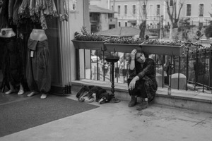 In this monochrome photograph, a young woman sits contemplatively against a wall, her hand resting on her forehead as she seems lost in thought. A sleeping dog lies beside her, adding an element of warmth to the starkness of the scene, which is framed by draped garments and a plant box. The soft, diffused lighting enhances the intimate mood, capturing a moment of stillness amidst a bustling backdrop.